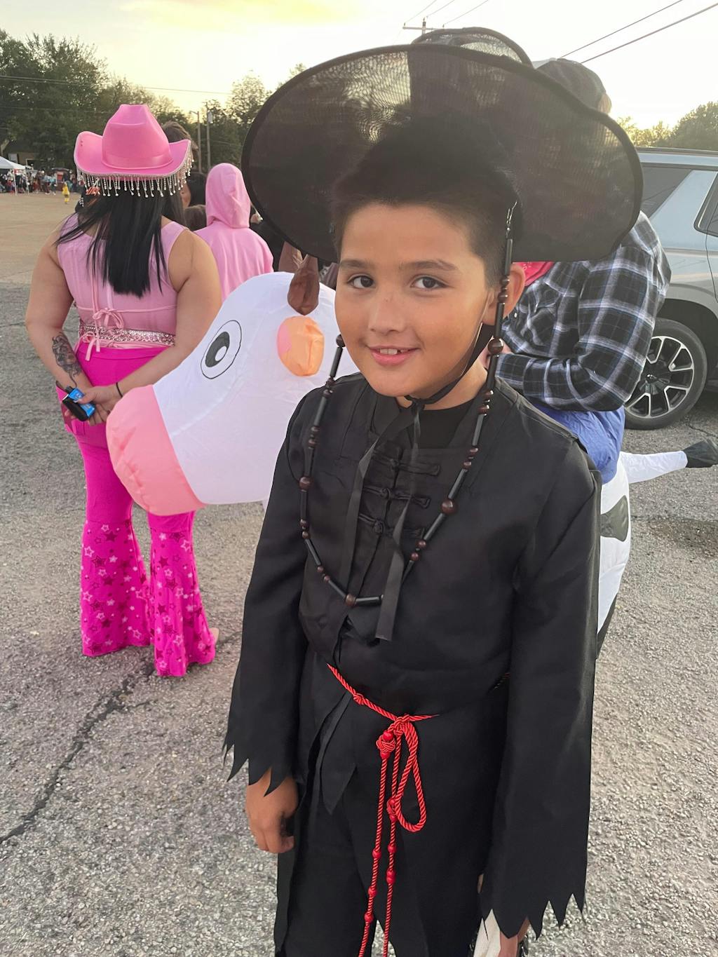 Design: Anime Boys Super Idol Costume featuring a black long-sleeve top with jagged edges, a black long vest for layered effect, a loose-fit pants, and a matching Korean-style wide-brimmed hat with hanging beads. restores the roles character.