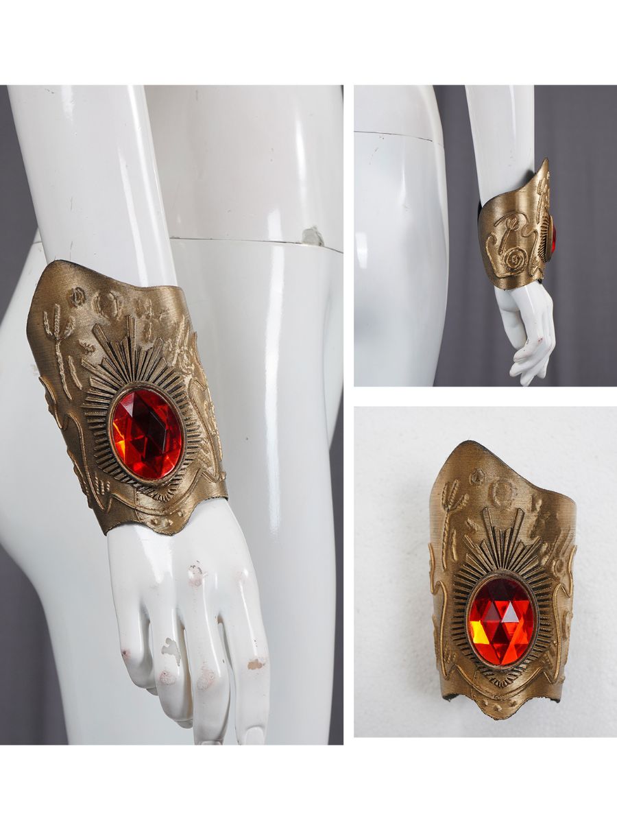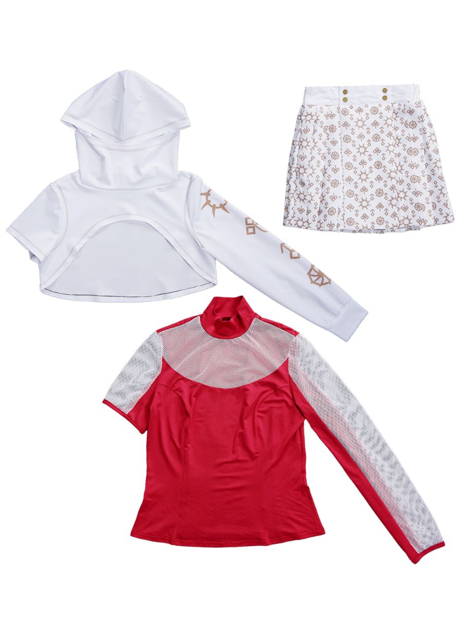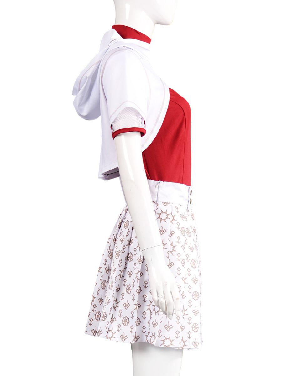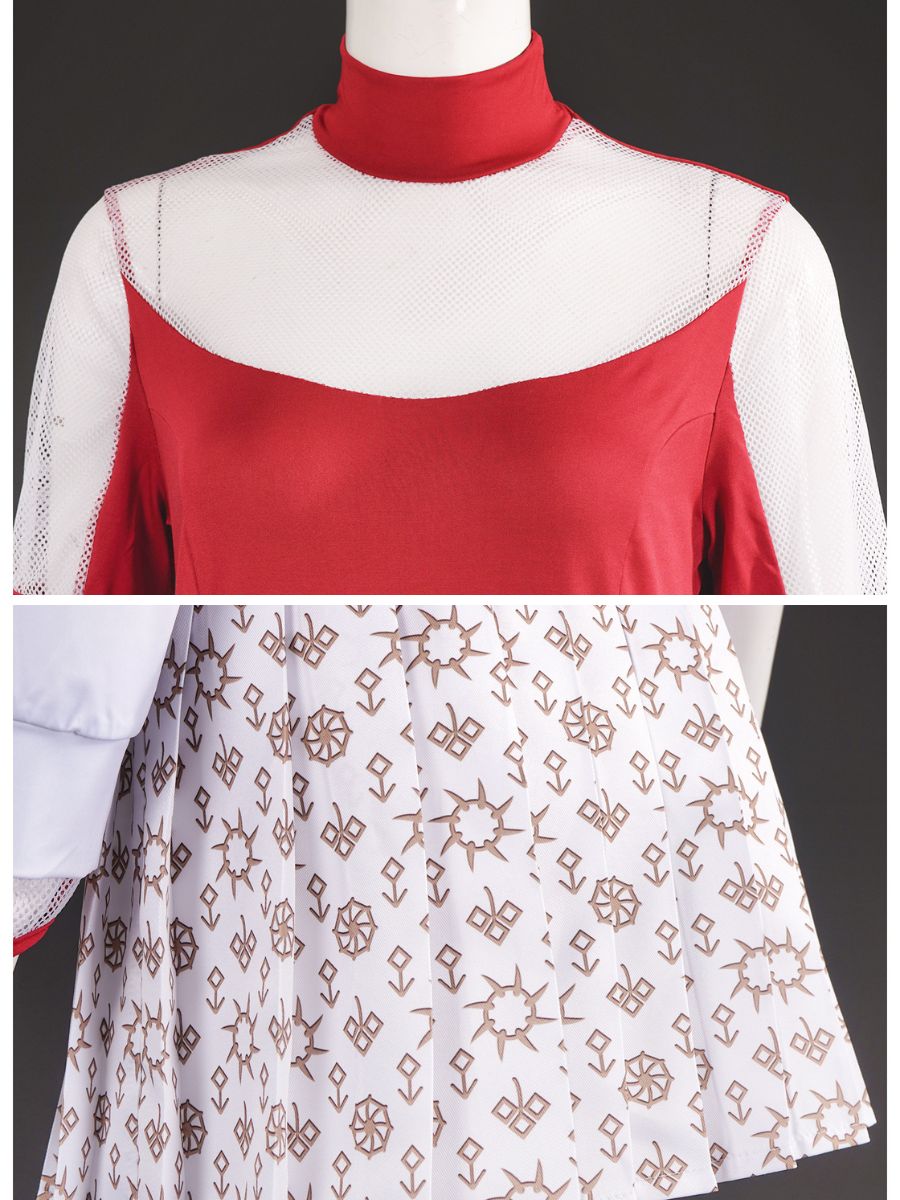 Design: American vampire musical film costume featuring a red t-shirt paired with a detailed white overlay, the asymmetrical sleeves and symbolic gold-toned print add unique flair, while the pleated skirt with decorative buttons enhances the playful yet elegant design, restores the roles character.