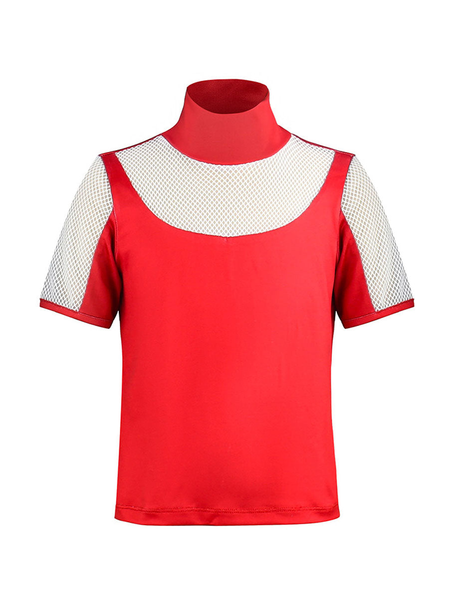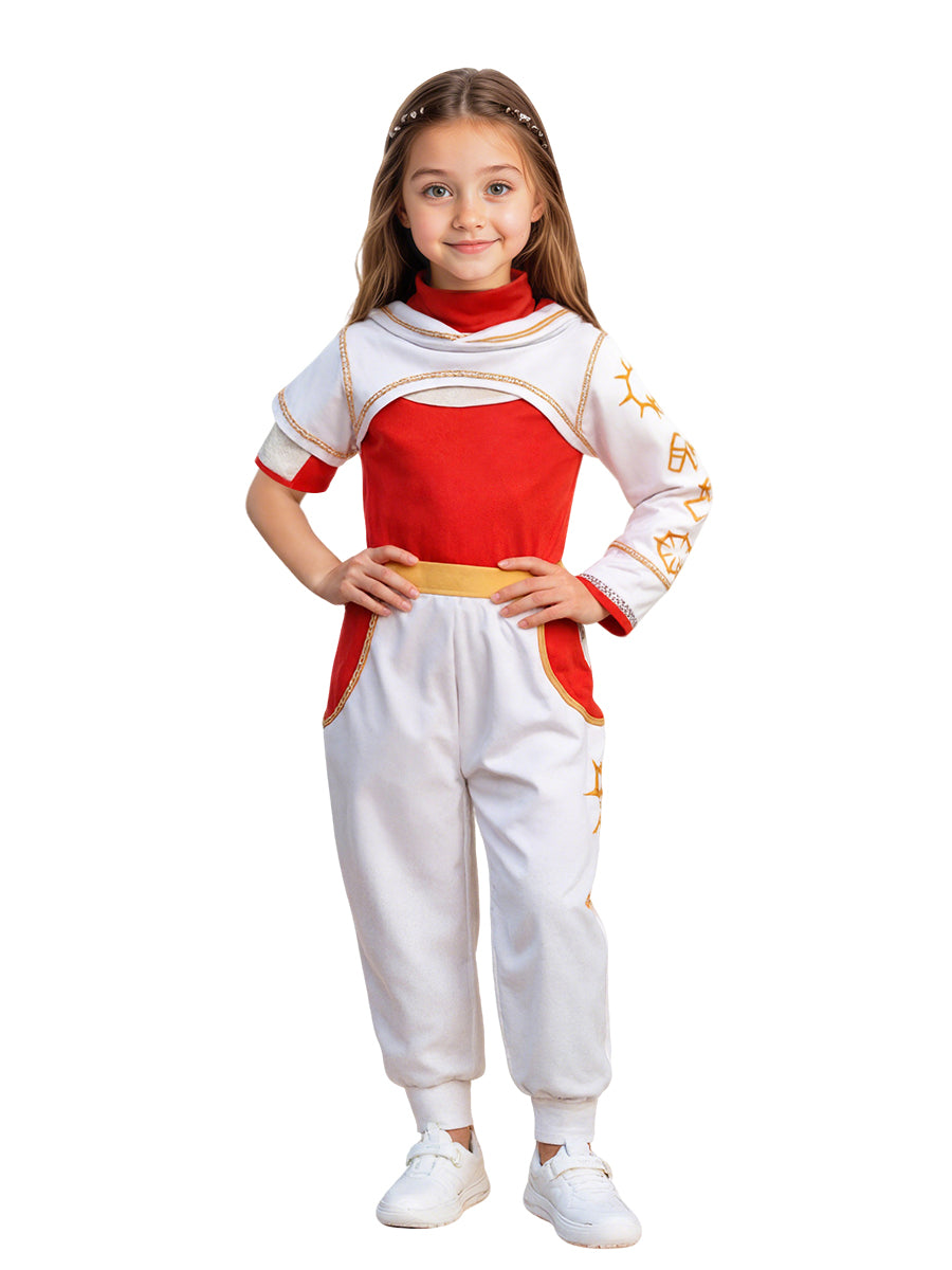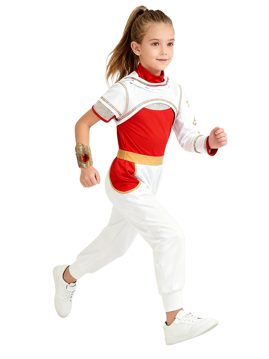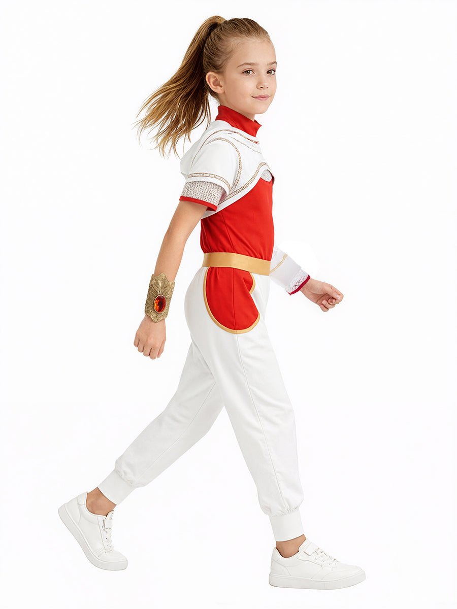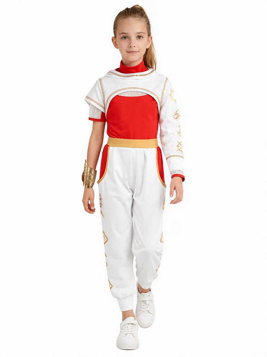 Design: American vampire musical film costume featuring a red t-shirt paired with a detailed white overlay, the asymmetrical sleeves and symbolic gold-toned print add unique flair, and matching white pants, restores the roles character.