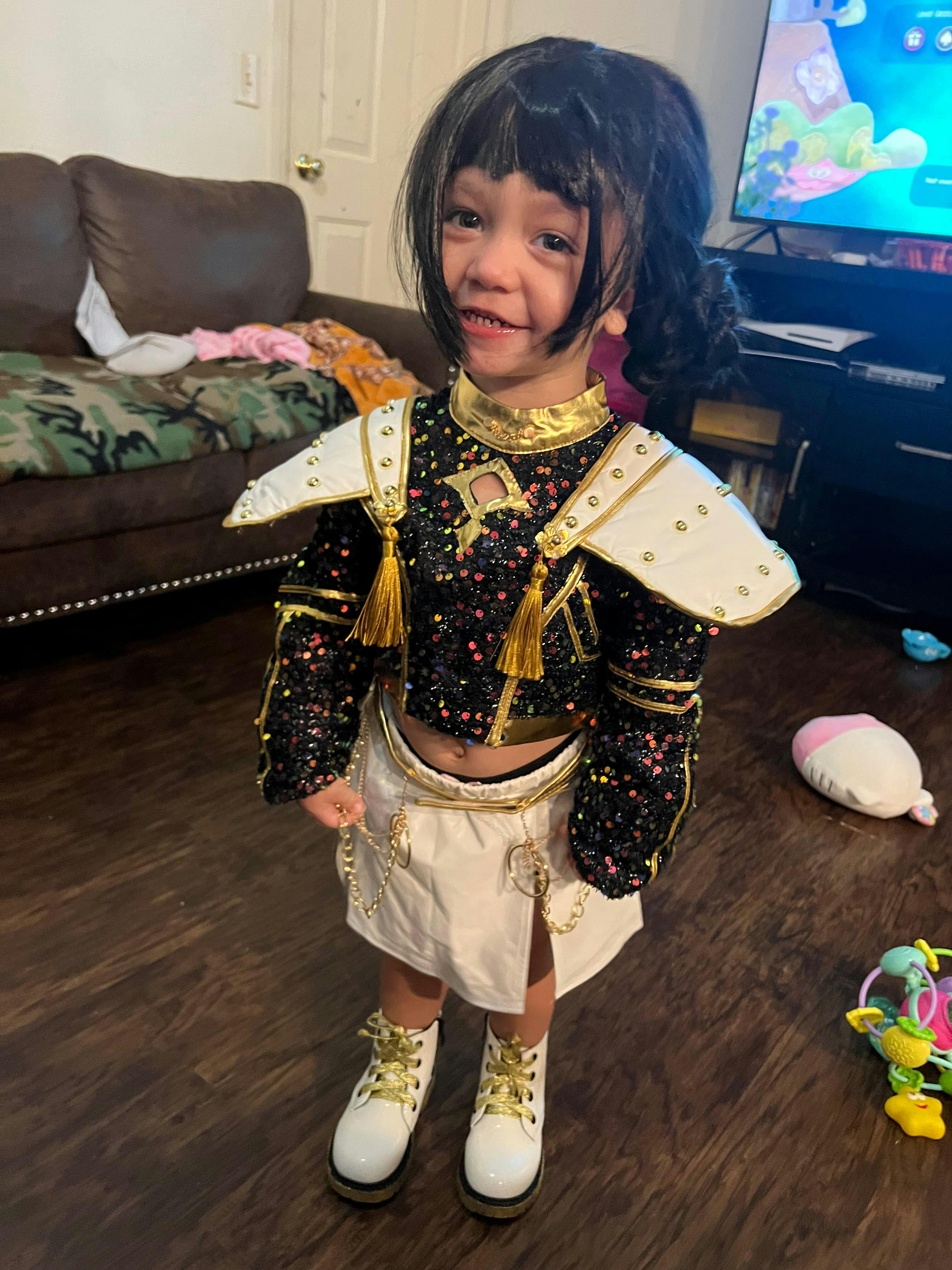 Design: Anime Super Idol Costume featuring a dazzling black sequin crop jacket with gold fringe epaulettes and regal shoulder detailing, paired with a matching sequin crop top. The sleek white skirt is adorned with gold ribbon accents and a coordinating black sequin waist sash, restores the roles character.