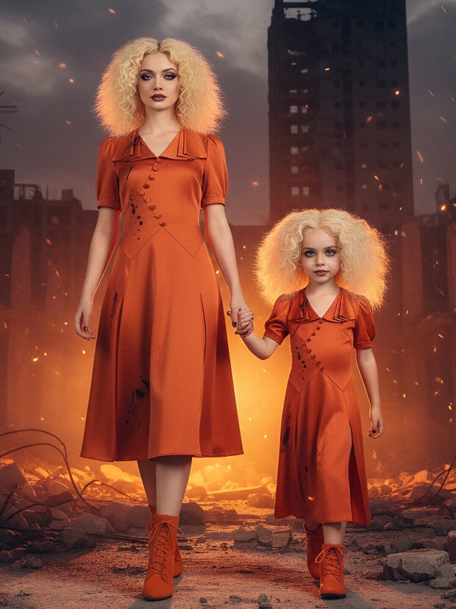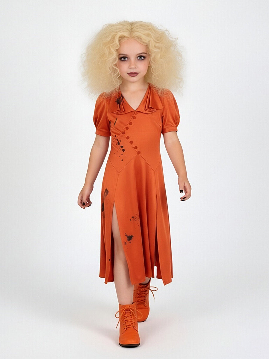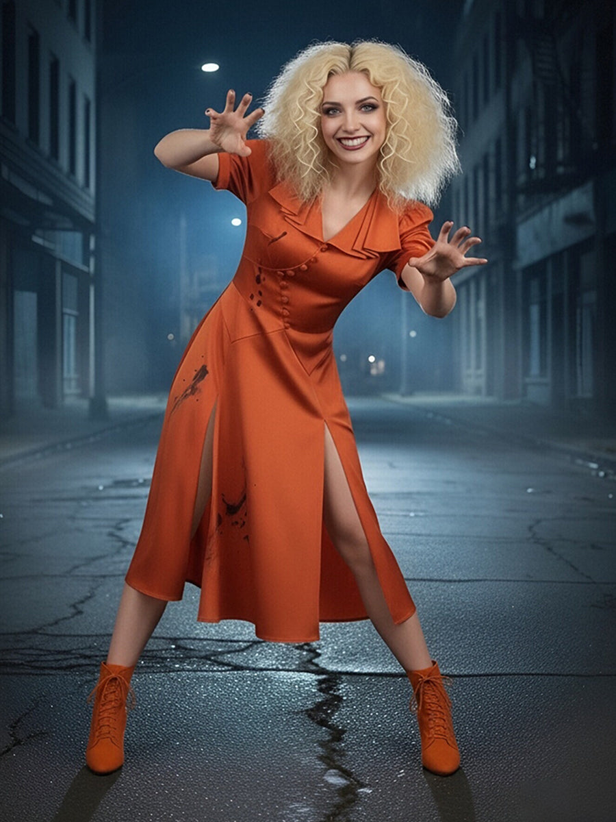 Design: Bride Cosplay Costume inspired by horror movie character, the red wedding dress, short puff sleeves, a unique asymmetric diagonal button-down placket, abstract ink splatter print, Stand out from the crowd and embody your favorite character with this stunning cosplay costume.