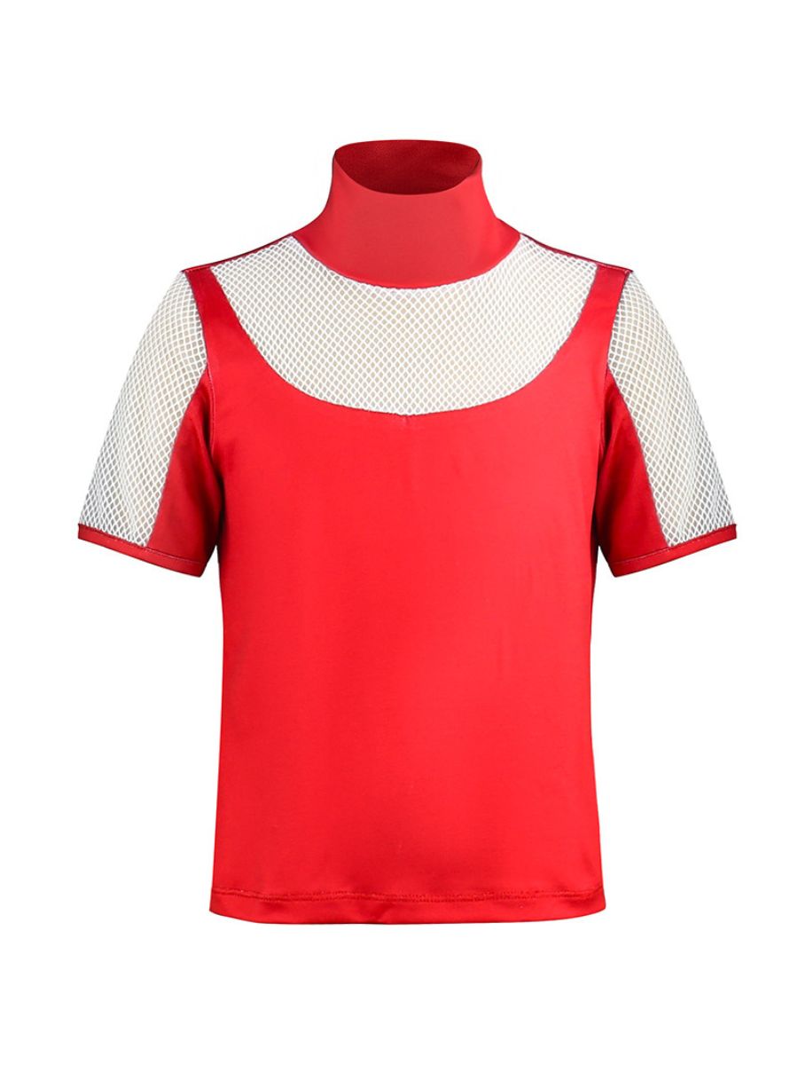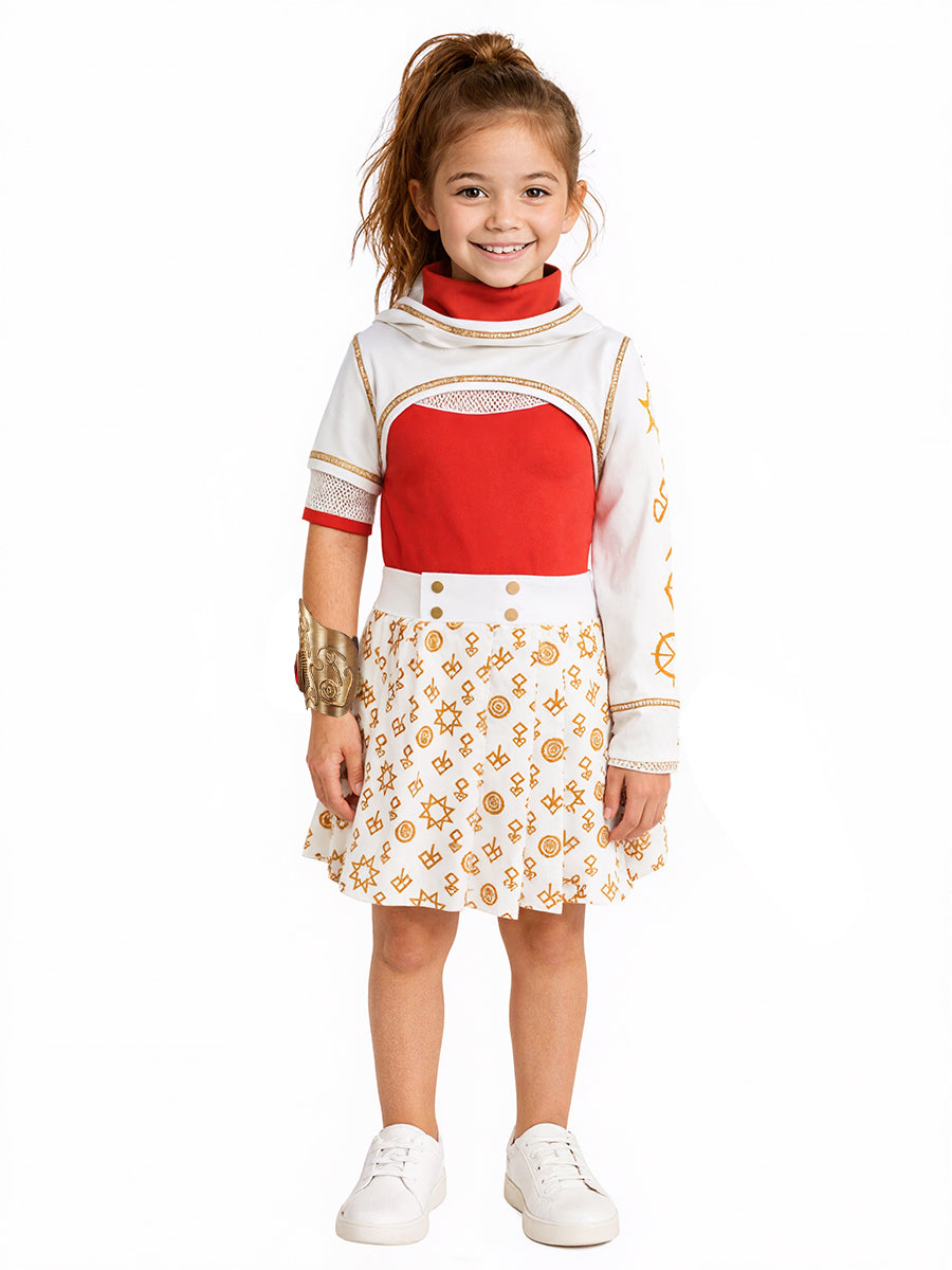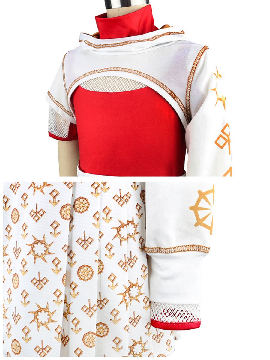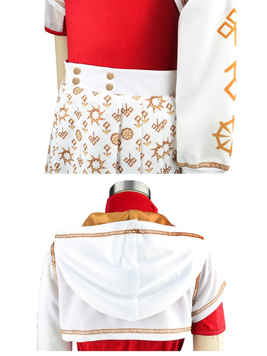 Design: American vampire musical film costume featuring a red t-shirt paired with a detailed white overlay, the asymmetrical sleeves and symbolic gold-toned print add unique flair, while the pleated skirt with decorative buttons enhances the playful yet elegant design, restores the roles character.