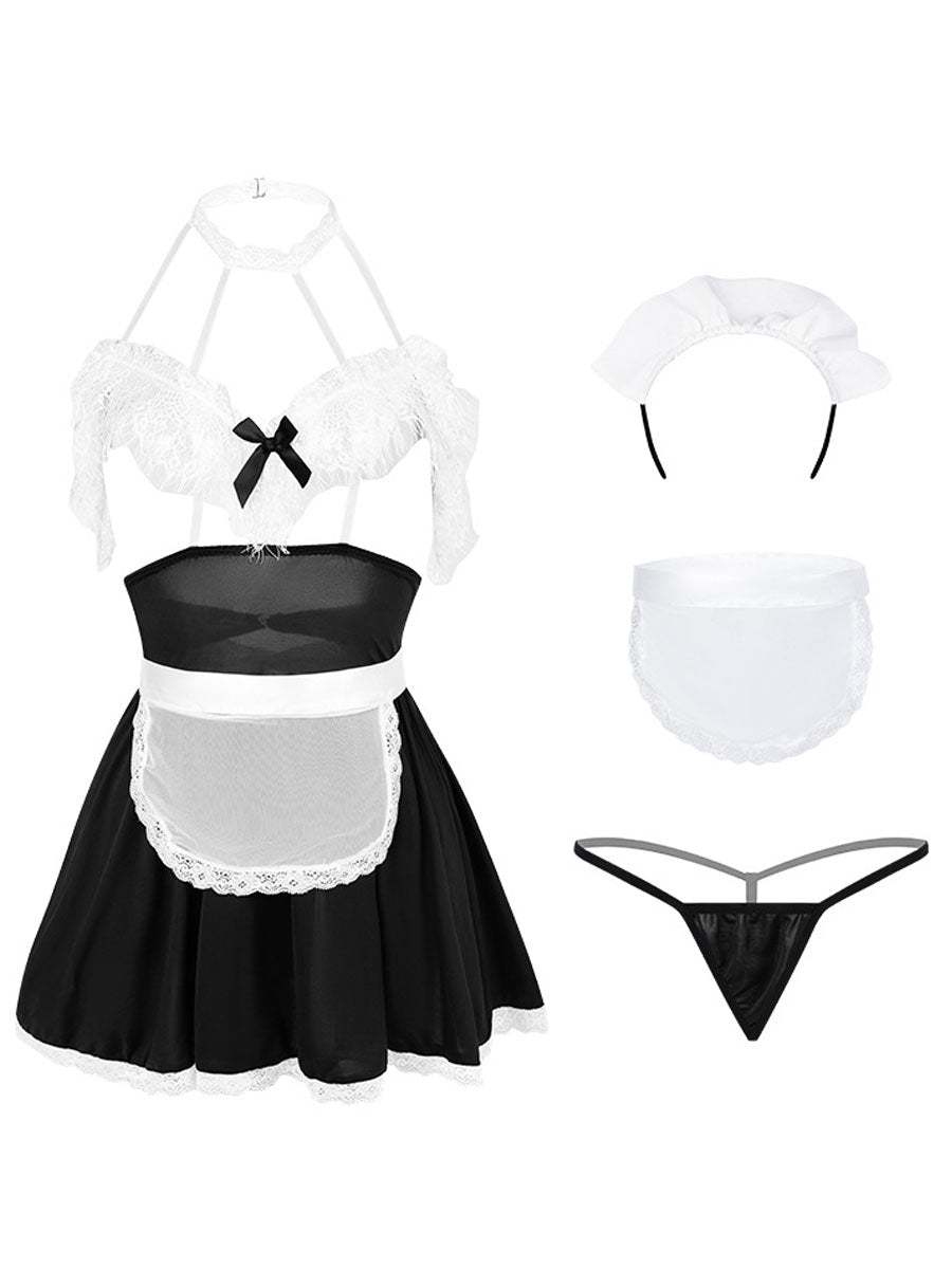 Design: Yomorio Sexy Maid Outfit featuring black and white mini dress, sheer lace cups, an attached lace choker with strap, open back with ties closure, and a matching apron, A classic look with playful detailing, this outfit is designed for all your cosplay needs.