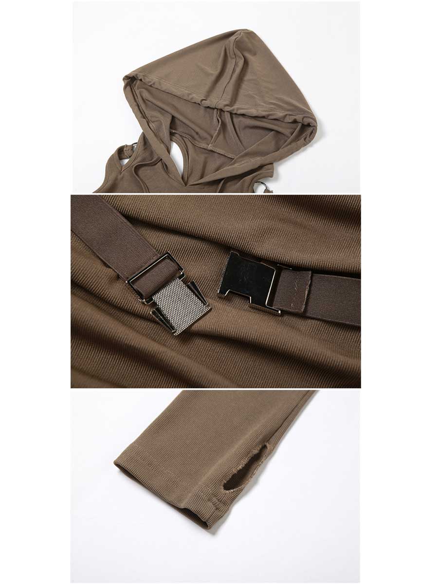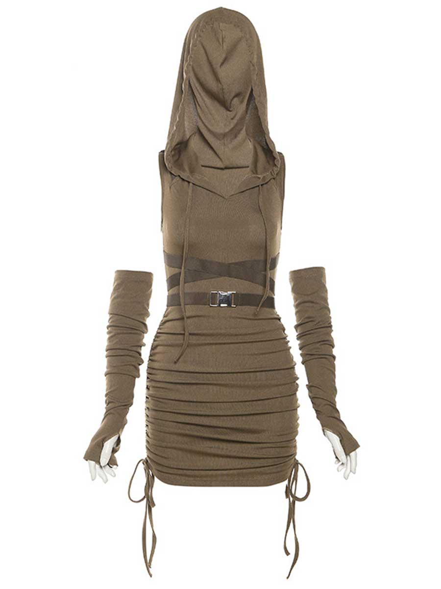 Design: Women's Hooded Bodycon Dress featuring an attached hood, a ruched skirt with an adjustable drawstring tie, a strappy body harness with buckle closures, and matching fingerless gloves, you'll stand out in any crowd. It's a must-have for fashion forward women.