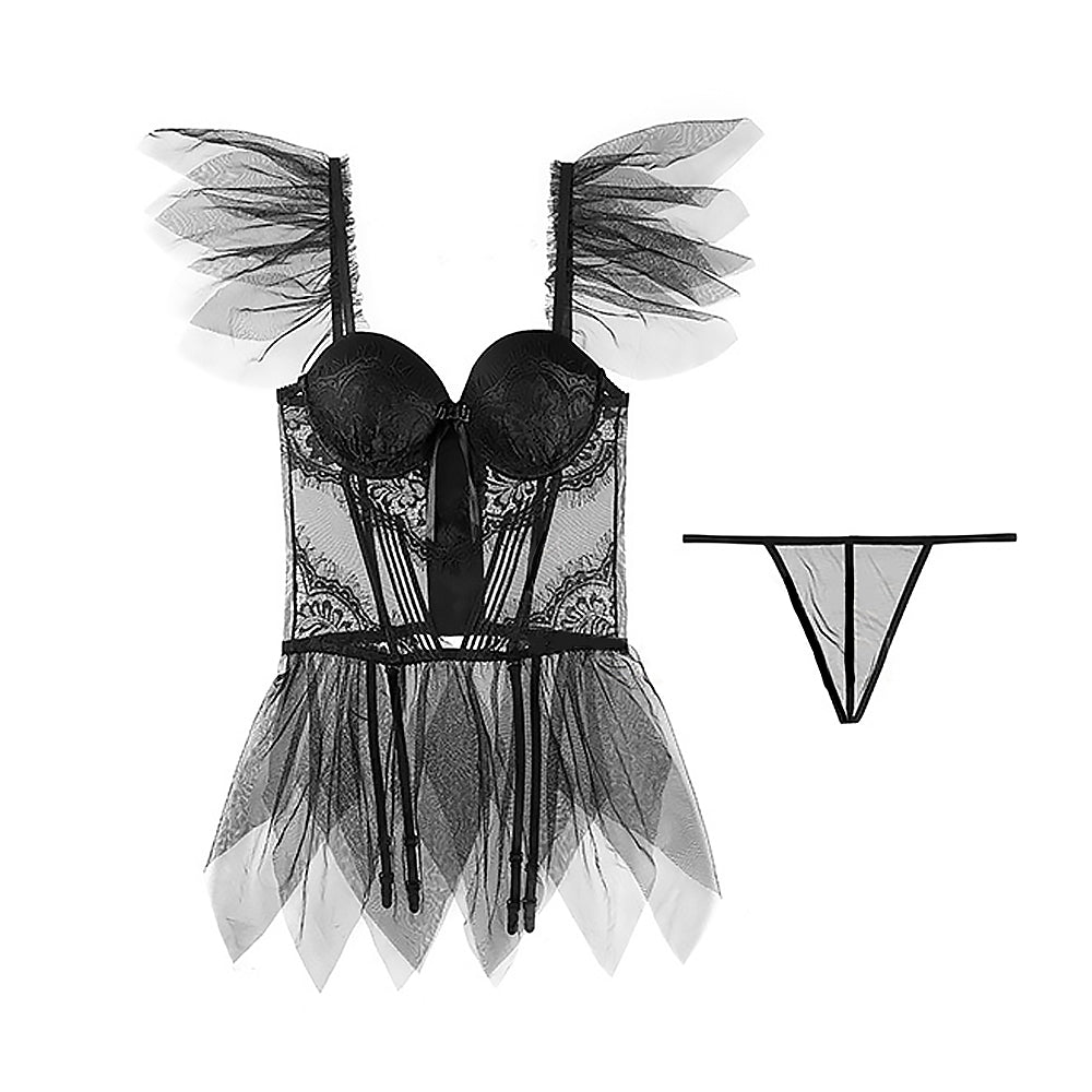 French Babydoll Lingerie Set Black Mesh Gothic Corset Dress Lolita Cosplay Anime Costume