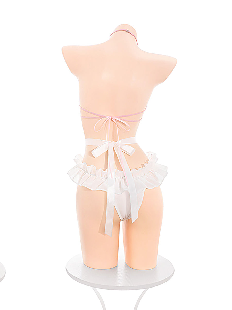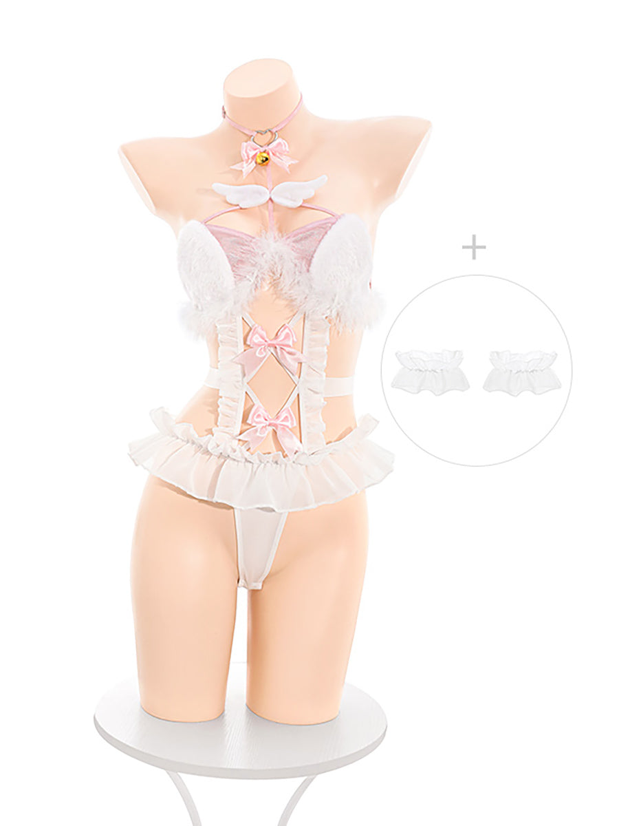 Design: Yomorio Open crotch teddy lingerie features a fuzzy winged bra, frilly mini skirt with lace-up detail, matching ruffle wrist cuffs, and a sweet pink choker with bell. Designed with soft feather-like textures, pink satin bows, snap crotch closures, and delicate ruffles, this costume creates an edgy yet playful look that will get all the attention.