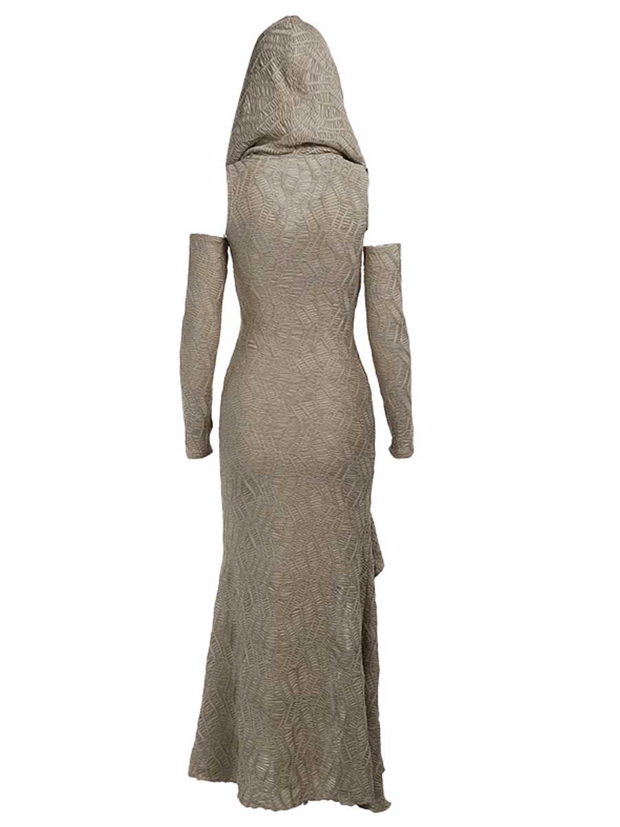 Design: Retro Waste Soil Style Costume featuring a high slit maxi dress, a form-fitting bodice with ruched details, and an asymmetrical hem. Even the sleeves are specially designed to match the overall aesthetic. Perfect for any occasion, this dress is sure to make a statement and turn heads.