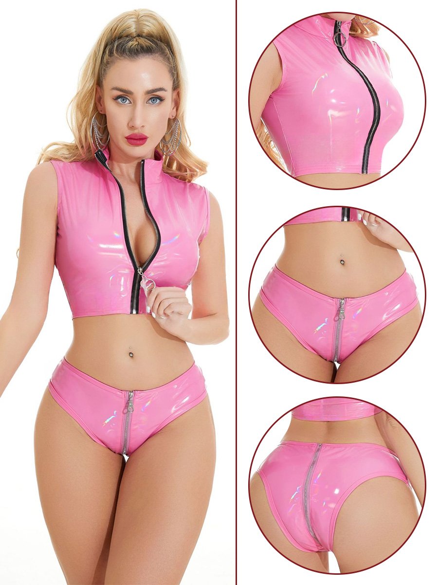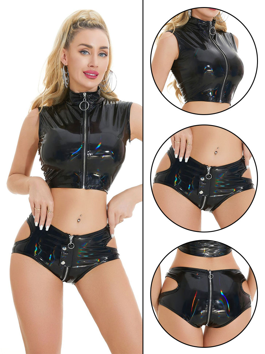 Design: Latex Two Piece Outfit featuring sleeveless cropped top, high neckline and a front zipper closure, a matching booty short with a zipper up closure and a cheeky cut back. The perfect choice for your next event, this outfit will make heads turn and is sure to be a hit.