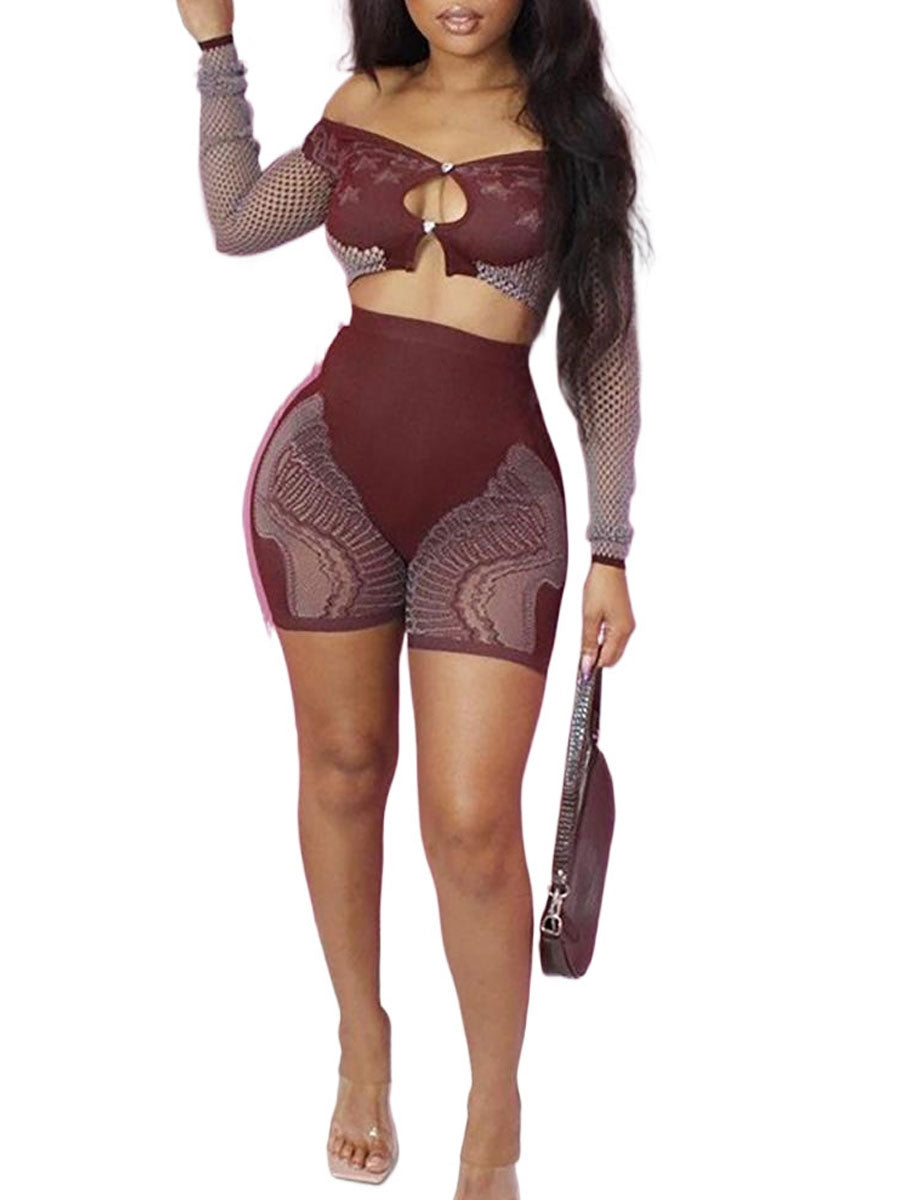 Design: This exclusive two piece bodystocking featuring a crop top with an off-the-shoulder neckline, long sleeves, sparkling rhinestone details, and a matching high waist seamless bottoms with a stunning geometric design.