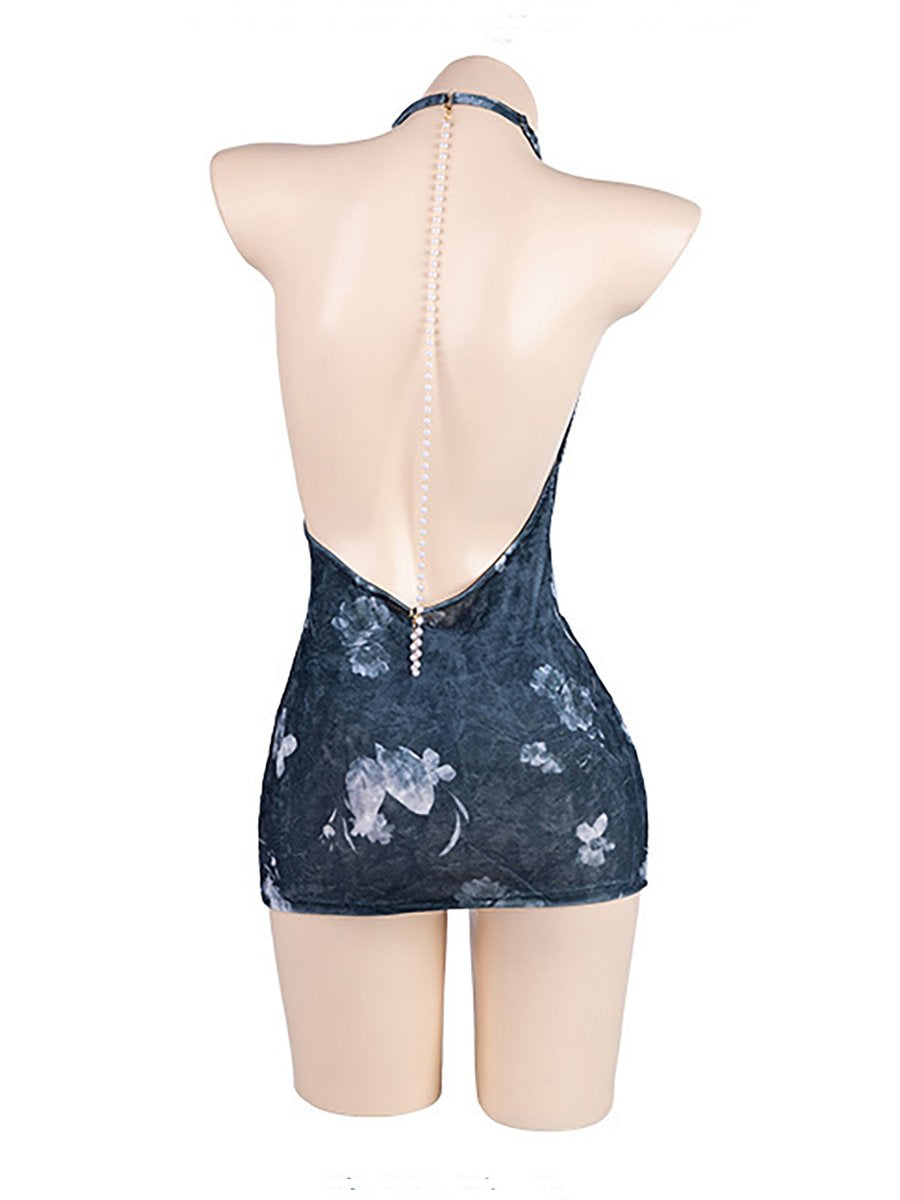 Design: Sexy Chinese Cheongsam Lingerie is designed with velvet mini dress, halter neckline, an allover floral print, back pearl chain. No restraints on chest with narrow bralette design, and the mini dress are definitely fit on your body curves outline. It makes you more attractive, charming, fashion and chic.