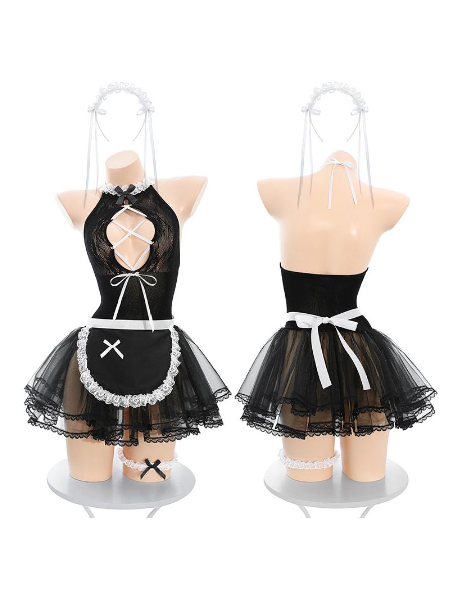 Design: Yomorio Sexy Maid Outfit featuring sheer lace halter lingerie dress, a keyhole lace-up front and layered ruffle skirt, a removable apron, matching lace garter, and a ruffled lace headband, creating a classic yet playful French Maid look.