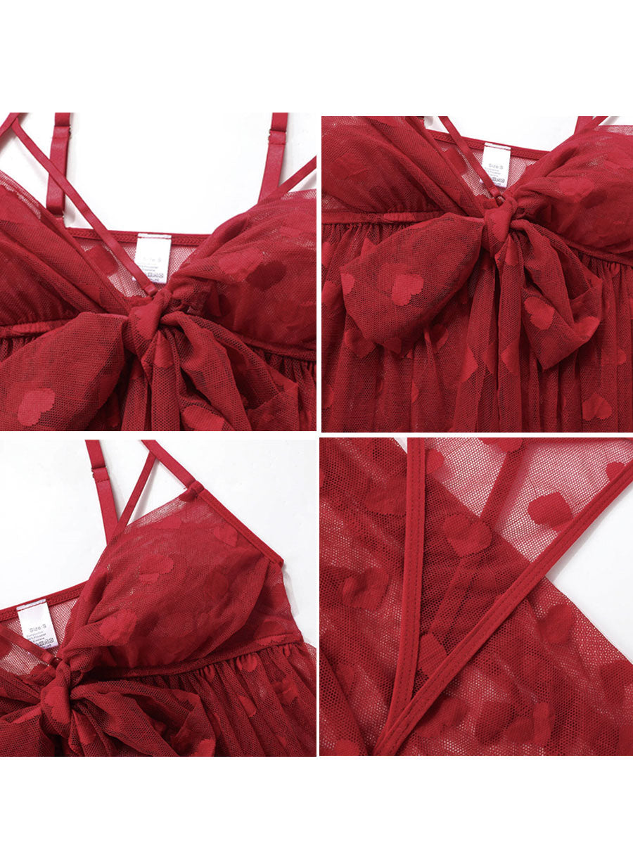 Design: This Sexy Flyaway Babydoll & Thong Set featuring sheer mesh cups with a strappy bust detail, adjustable spaghetti straps, a tulle bow accent, an allover heart print, and a sheer mesh bodice with flyaway open front.