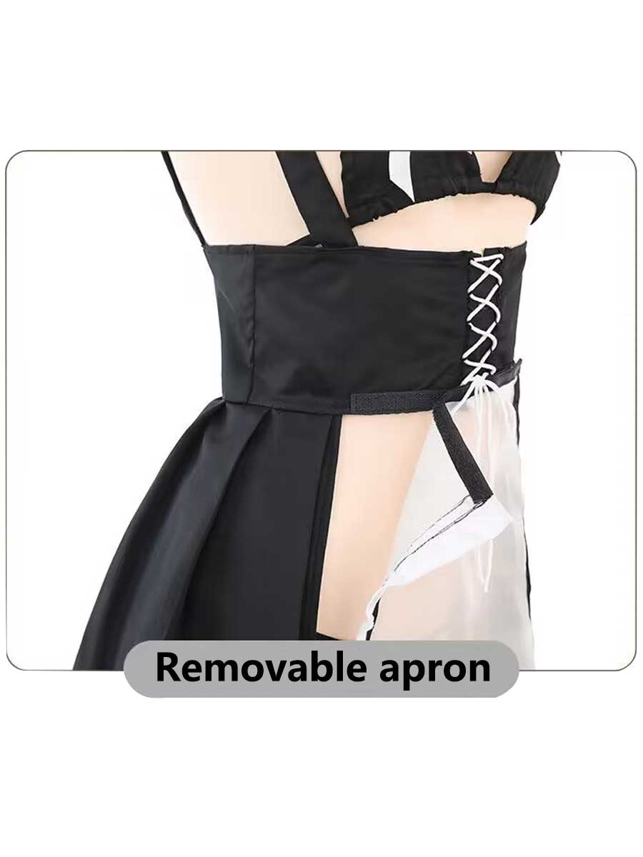 Design: Yomorio sexy maid costume featuring a black micro triangle bra, a matching adjustable suspended mini skirt, front lace-up design, removable white mesh apron with velcro. Add some playfulness to your bedroom routine with this flirty and alluring maid costume.