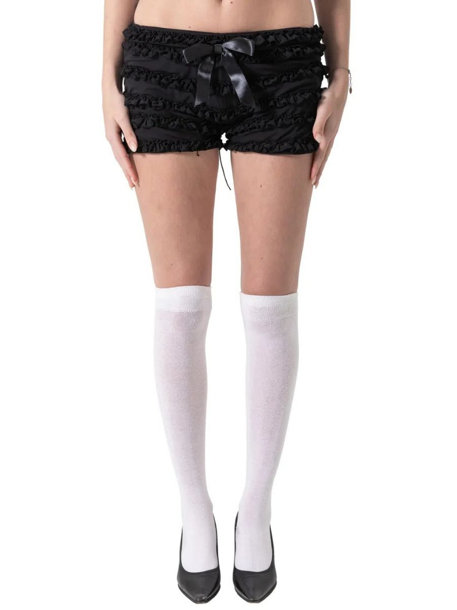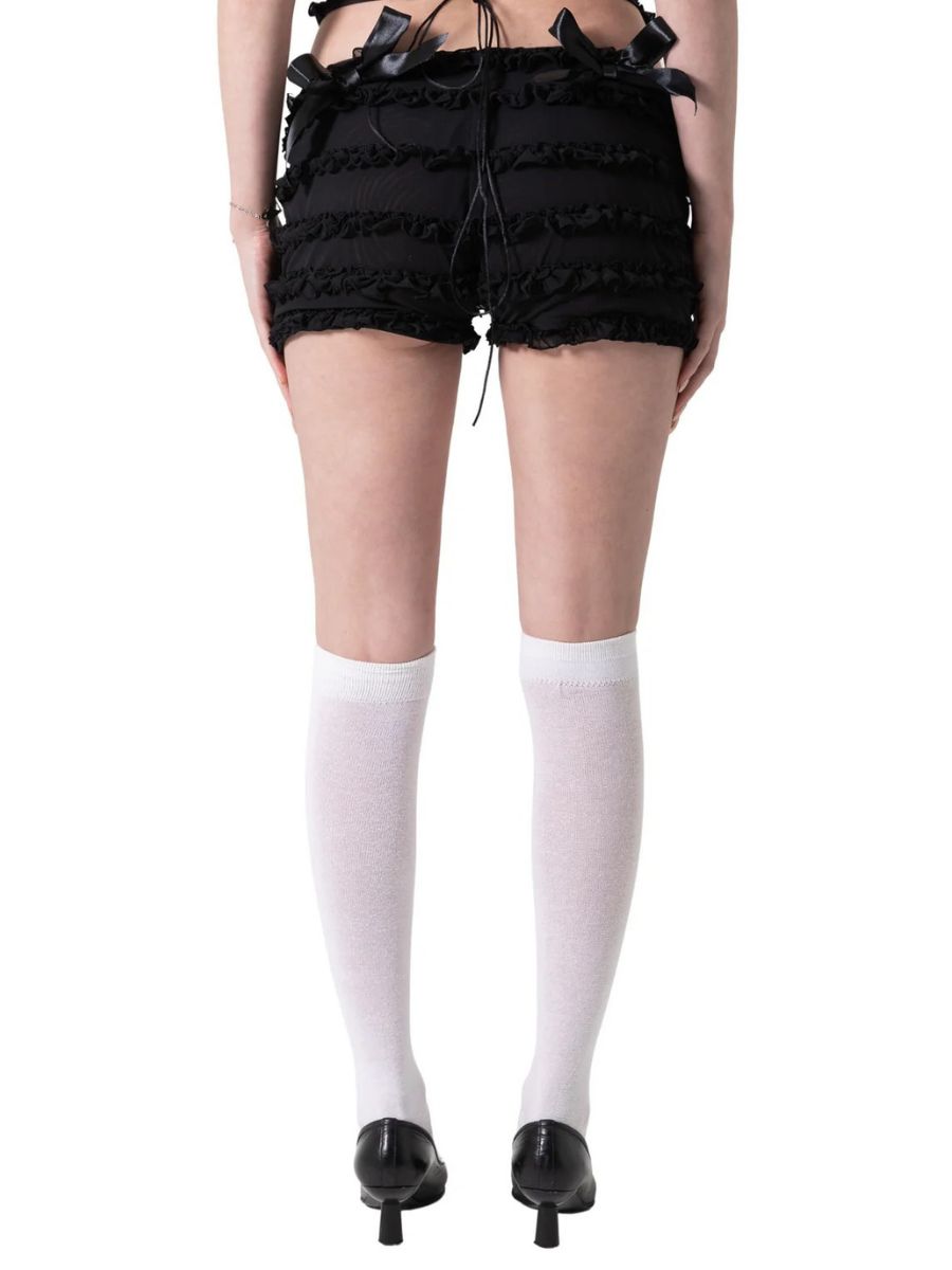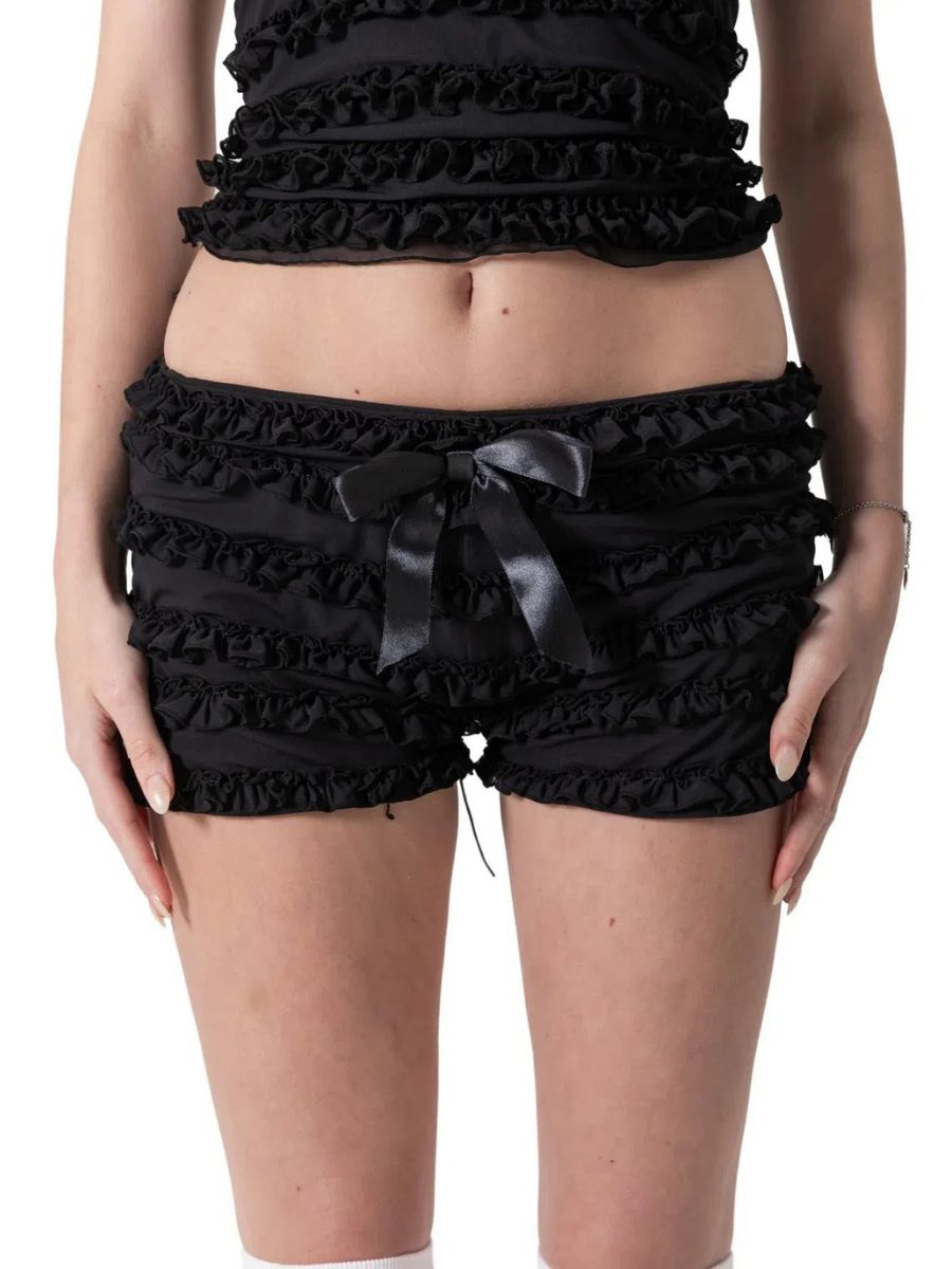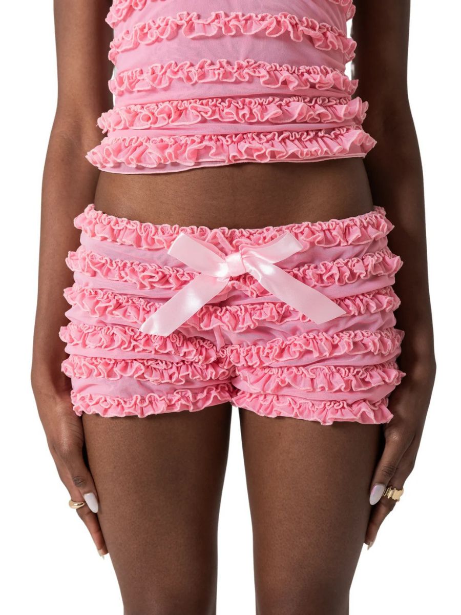 Design: Sexy Night Club Outfit Set featuring short-sleeve top, allover ruching and fluttery frills, an open back with crisscross lace-up detailing, The matching ruffle-trimmed shorts sit low on the waist and are finished with dainty satin bows for an extra touch of charm.