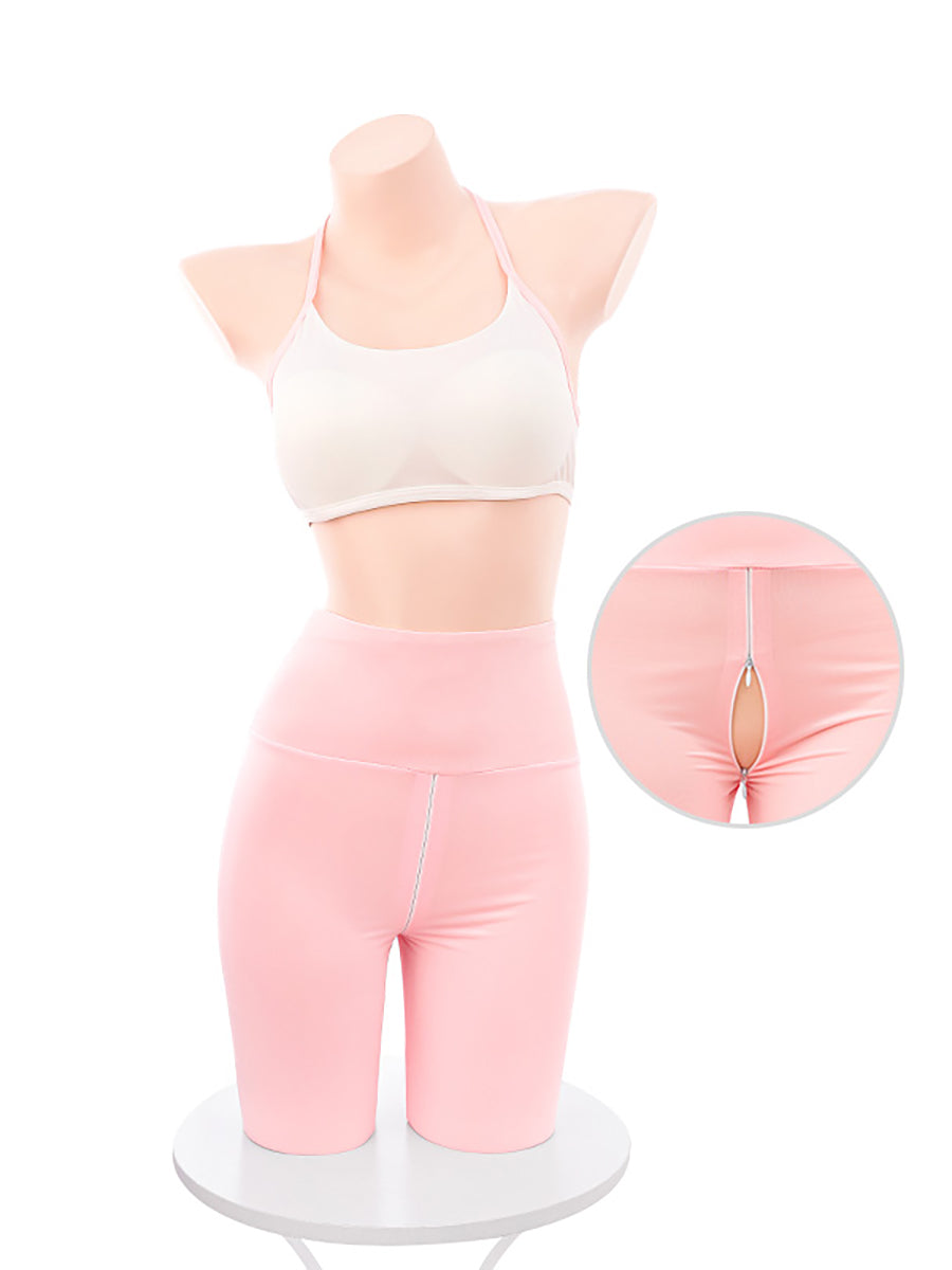 Design: Two-piece crotchless workout set featuring a white cropped top with padded cups, back adjustable straps, and a pink fitted legging, zipper up crotch. Perfect for spicing up your lingerie collection or for a sensual yoga session.