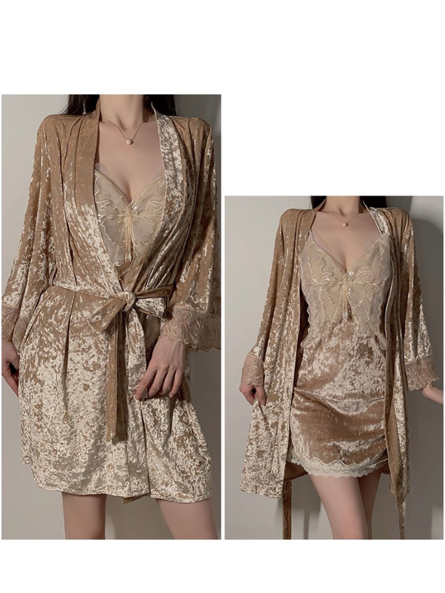Design: This ultra sexy Pajamas Set featuring velvet mini dress, adjustable spaghetti straps, sheer mesh butterfly panels, and a high slit hemline. Fleece robe featuring sheer mesh trim, long sleeves with ruffled cuffs, and a waist tie.