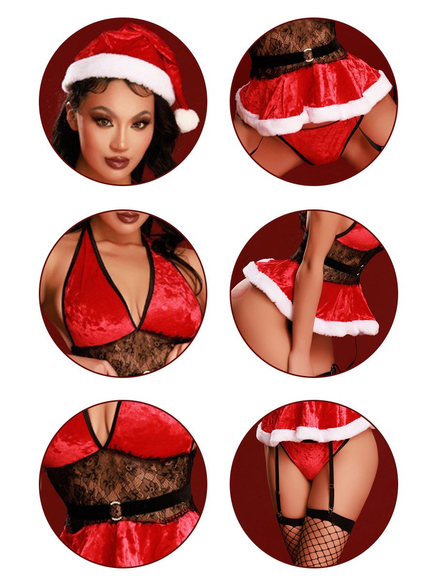 Design: This Sexy Red Christmas Lingerie features velvet babydoll with halter neckline, a black sheer lace waistband, adjustable garter straps, a white furry hemline, and a matching panty, it thoroughly shows off your stunning curves.