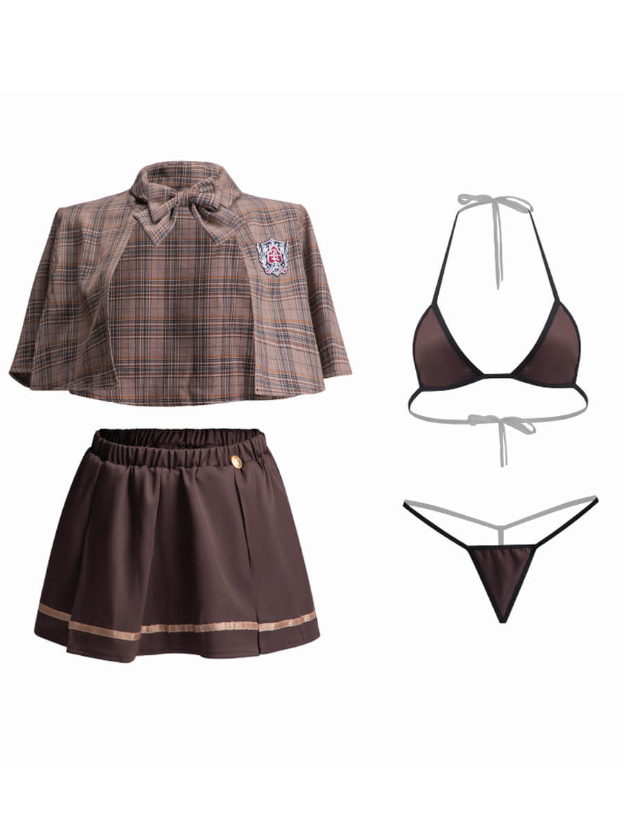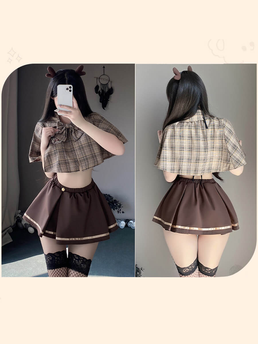 Design: Yomorio Cosplay Lingerie Set featuring brown plaid cape with a crest patch, mini skirt with elastic waistband and striped hemline, makes you more lovely and charming.