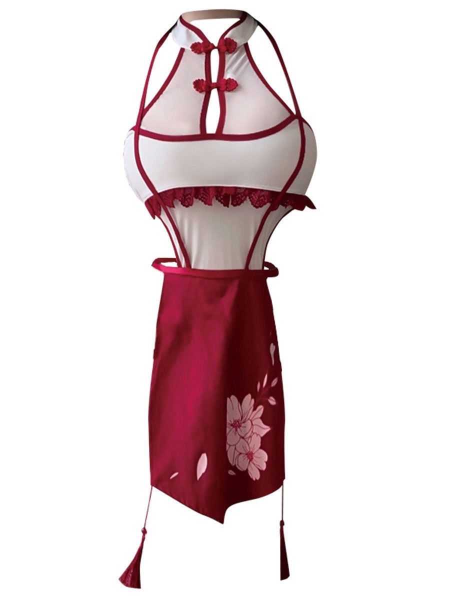 Design: Sexy Chinese Cheongsam Lingerie is designed with white bodysuit with Red Skirt, floral print, traditional chinese collar, and high slit hemline. No restraints on chest with narrow bralette design, and the mini dress are definitely fit on your body curves outline. It makes you more attractive, charming, fashion and chic.