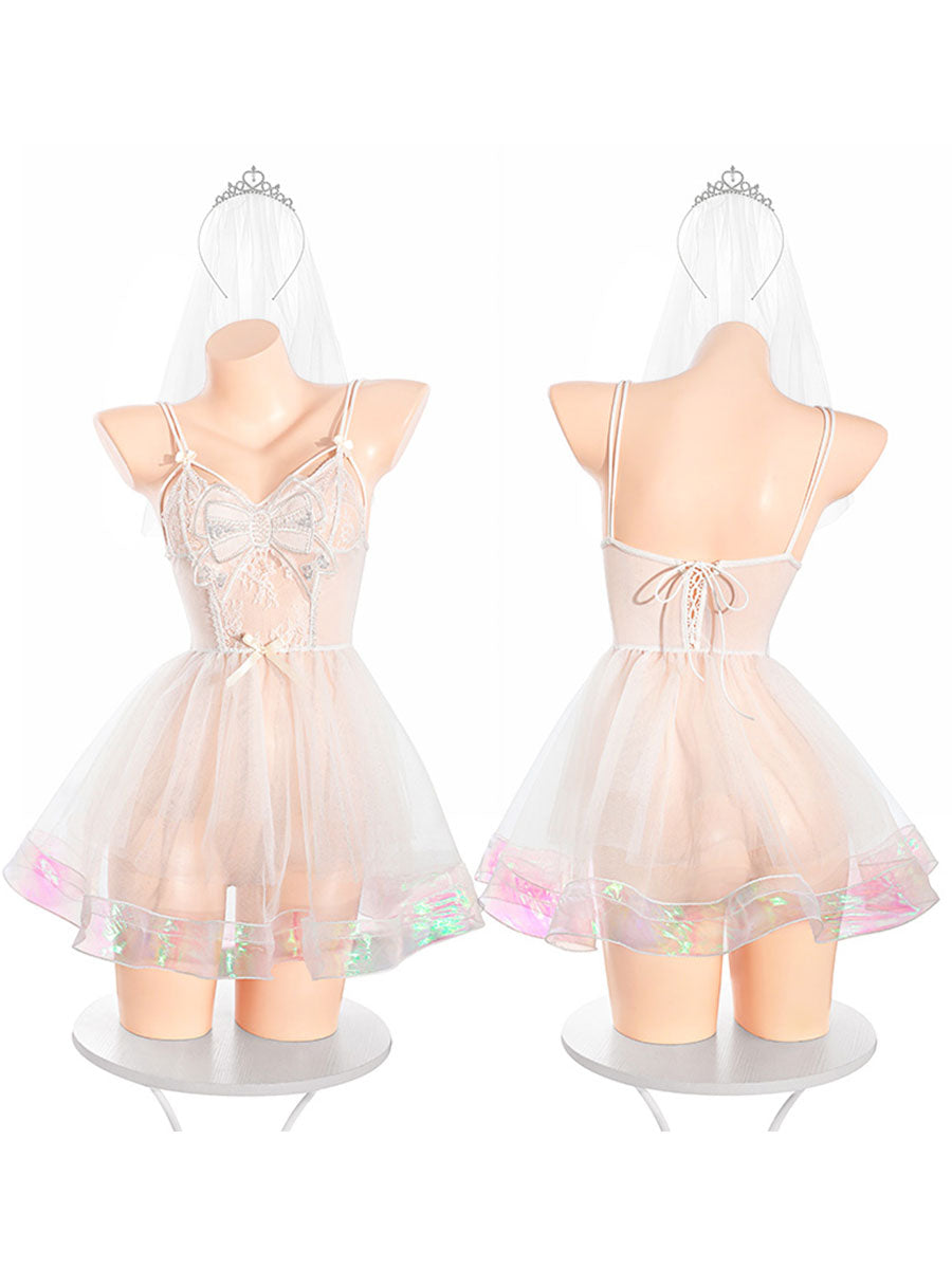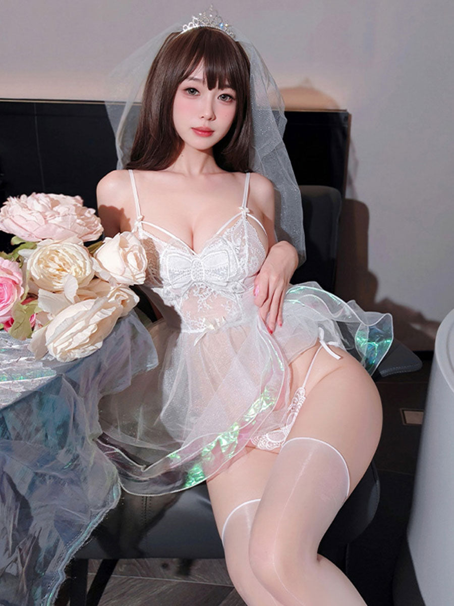 Design: Sexy Bridal Cosplay Lingerie: This dreamy bridal outfit features a sheer mesh babydoll dress with a sparkling iridescent hem, delicate lace detailing, and a large butterfly bow at the bust. The open-back design with corset-style lacing adds a romantic touch, while the included tiara veil headpiece completes your fantasy bride transformation.