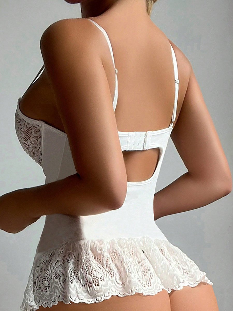 Design: 2-piece Lace Bustier Set features sheer lace underwire cups, adjustable spaghetti straps, a sheer floral lace bodice, front lace up details, a hook and eye back closure, adjustable garter straps, and a matching thong.