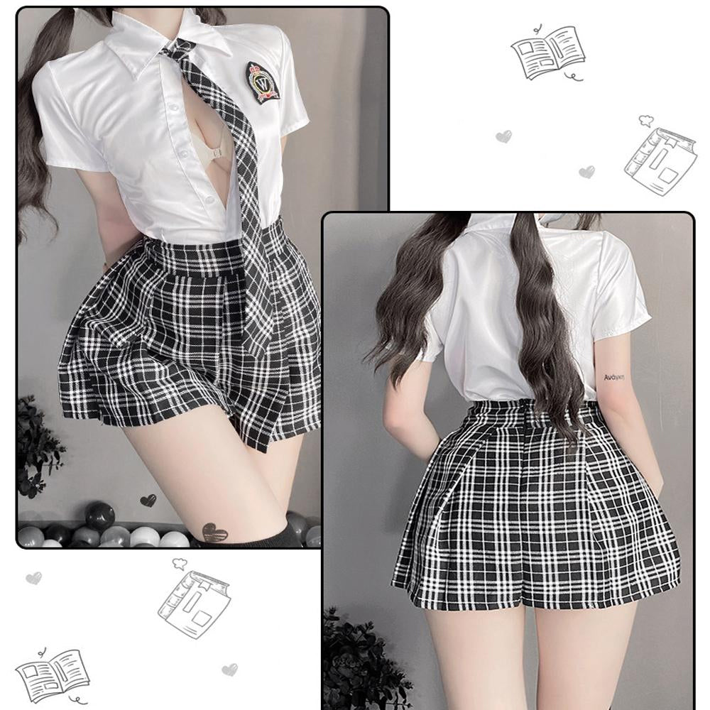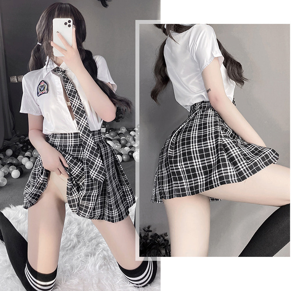 Package Including: 1 white shirt+ 1 plaid skirt+1 necktie+1 panty+ 1 pair of stocking