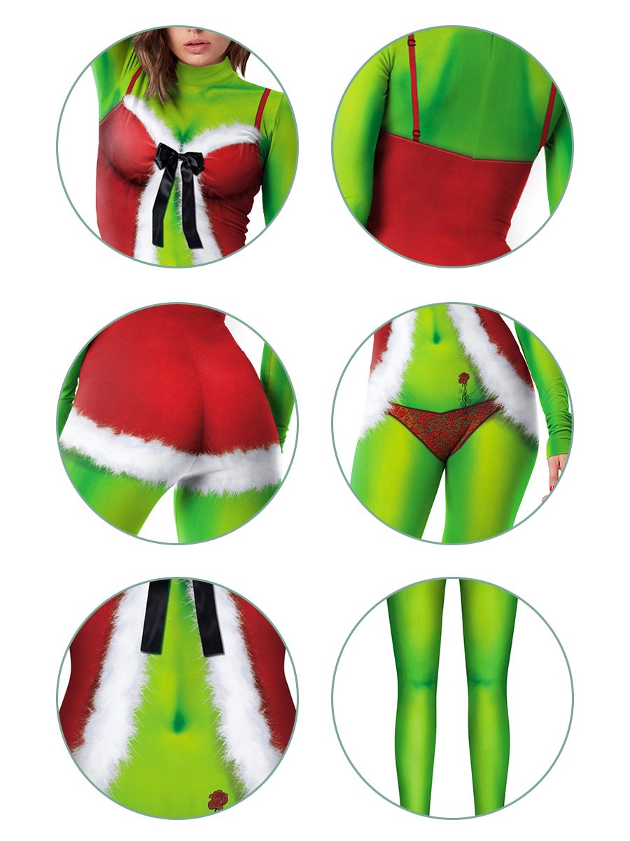 Design: Christmas animated film Role-playing Cosplay Costume featuring a full body jumpsuit with a high neckline, long sleeves, back zipper up closure, fitted legs, an allover 3D printed design, restores the roles character.