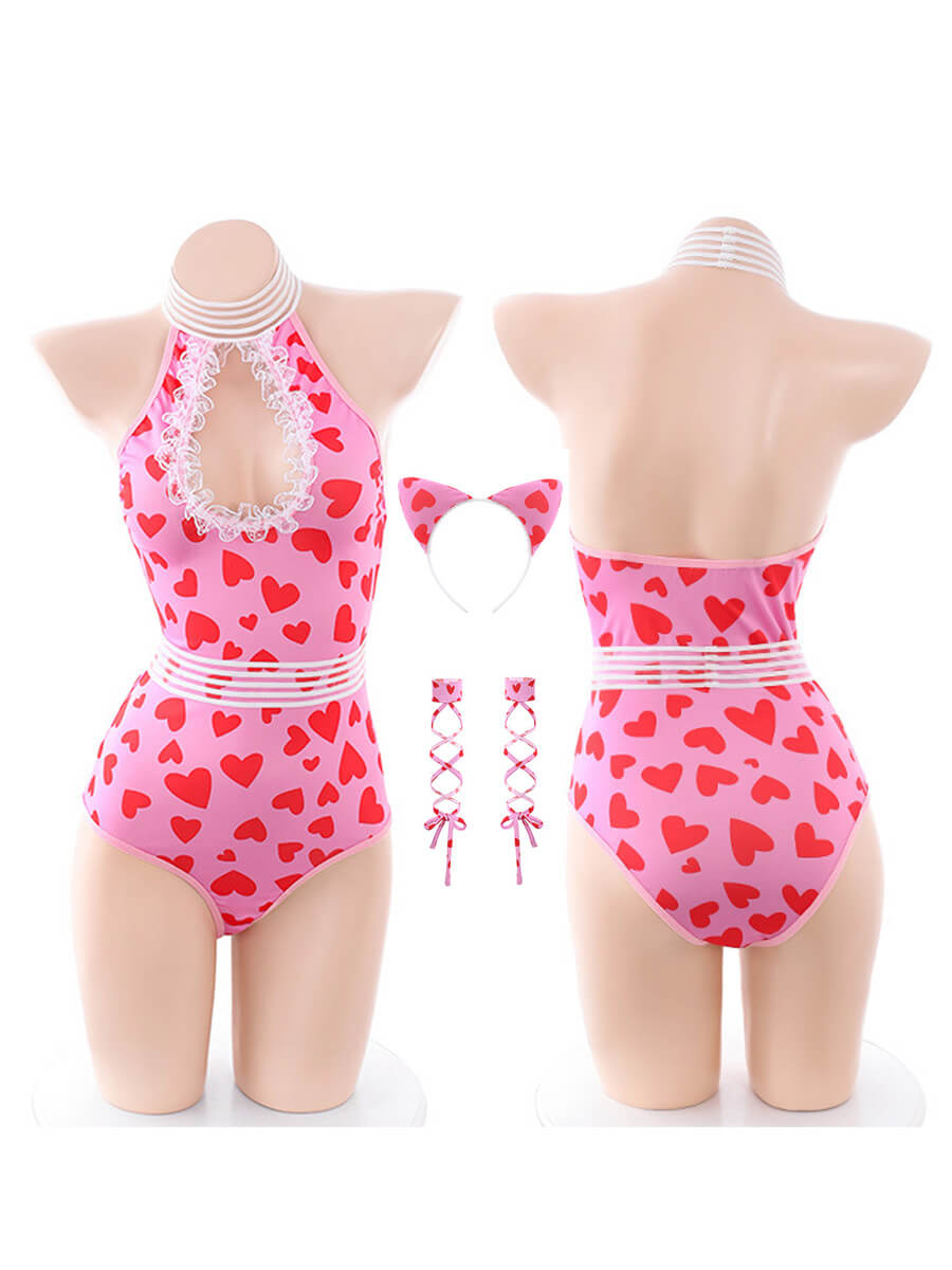 Yomorio Anime Neko Cat Lingerie Set Cutout Kitten Cosplay Costume Halter Neck Heart Print Bodysuit