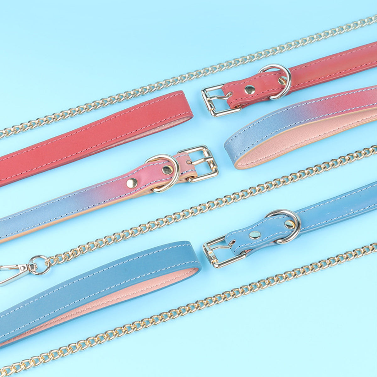 Design: This Reflective Choker collar leash featuring a gold plated O-ring detail with a luxe link chain, a feisty faux leather hand loop, and an adjustable collar.