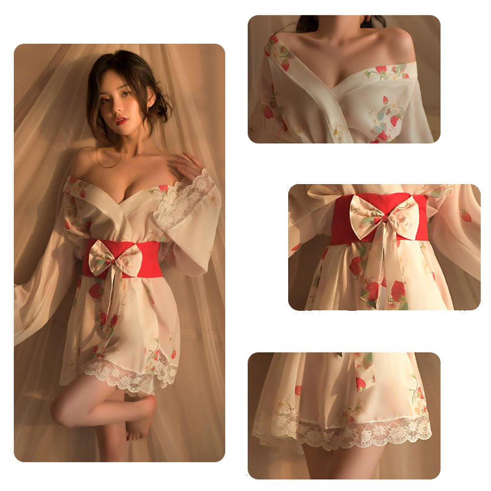 Design: sexy japanese cosplay lingerie is semi-transparent but still offers some coverage. Show off your curves and figure while staying comfortable. Wrap around gorgeous Japanese kimono belt (obi) with velcro for a snatched waist. Kimono with wide sleeves, lace trimming and a cute bow at the front. This cute strawberry print on this women's kimono pajamas adds interest to your life and makes you look younger and sexier.