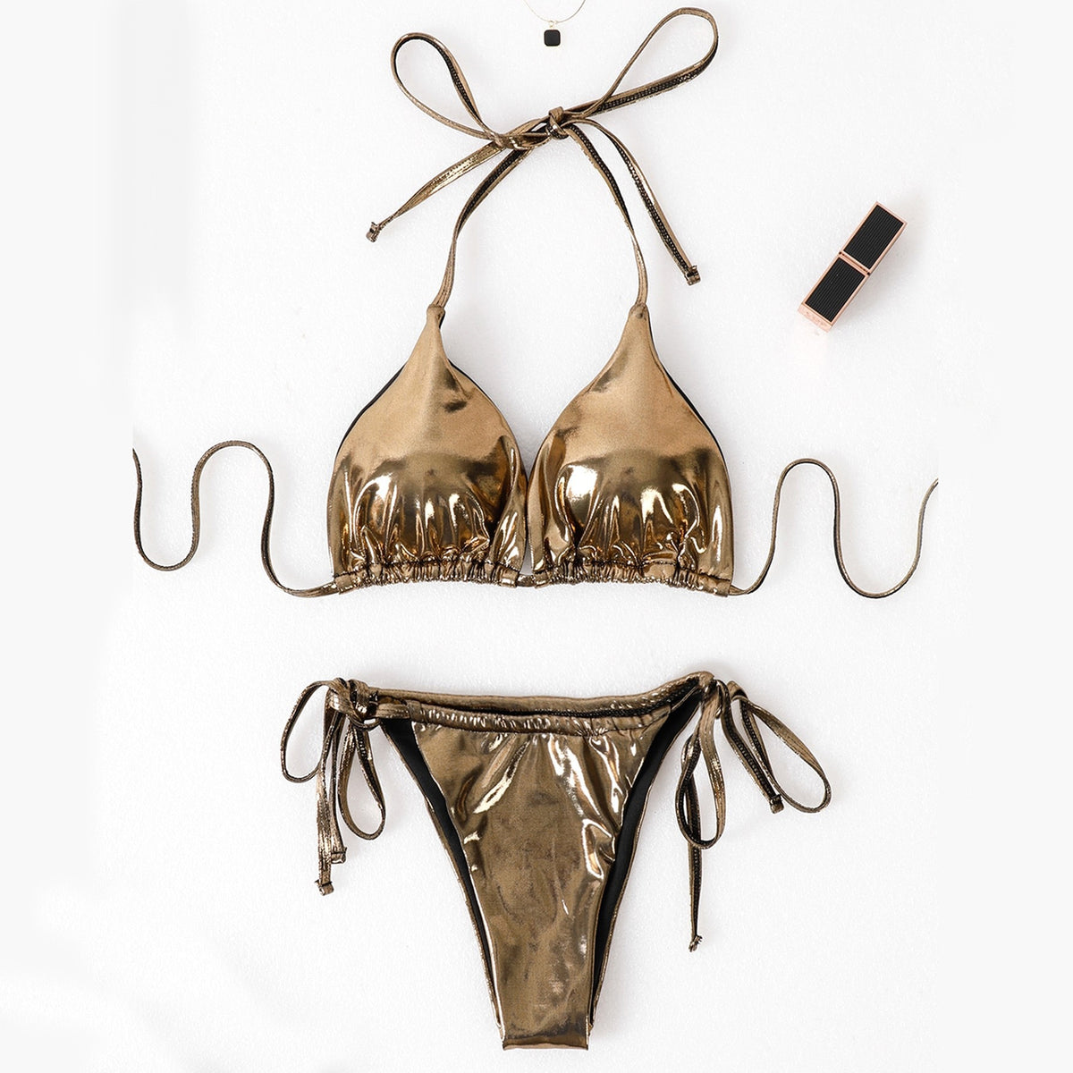 - Sexy metallic 3 piece bikini featuring bikini top with triangle cups, and a matching mini skirt with panty