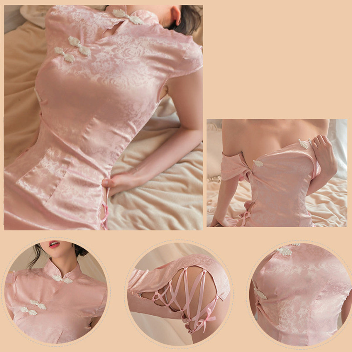 Design: Yomorio Sexy Jacquard Chinese Lingerie featurings pink slim fit cheongsam dress, classic retro stand collar, traditional chinese buckle, one side lace-up design allow it to fit more sizes, the length of the cheongsam can't completely cover the buttocks, which is extremely sexy.
