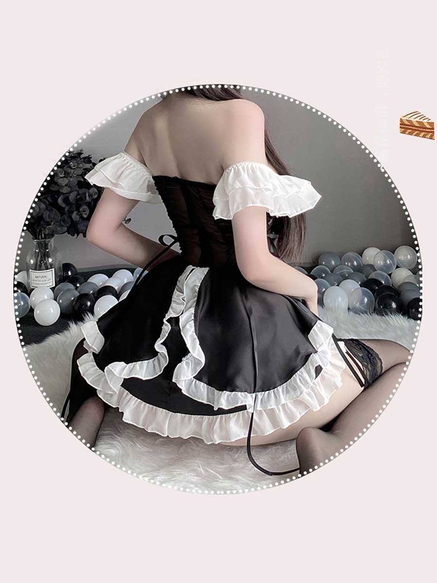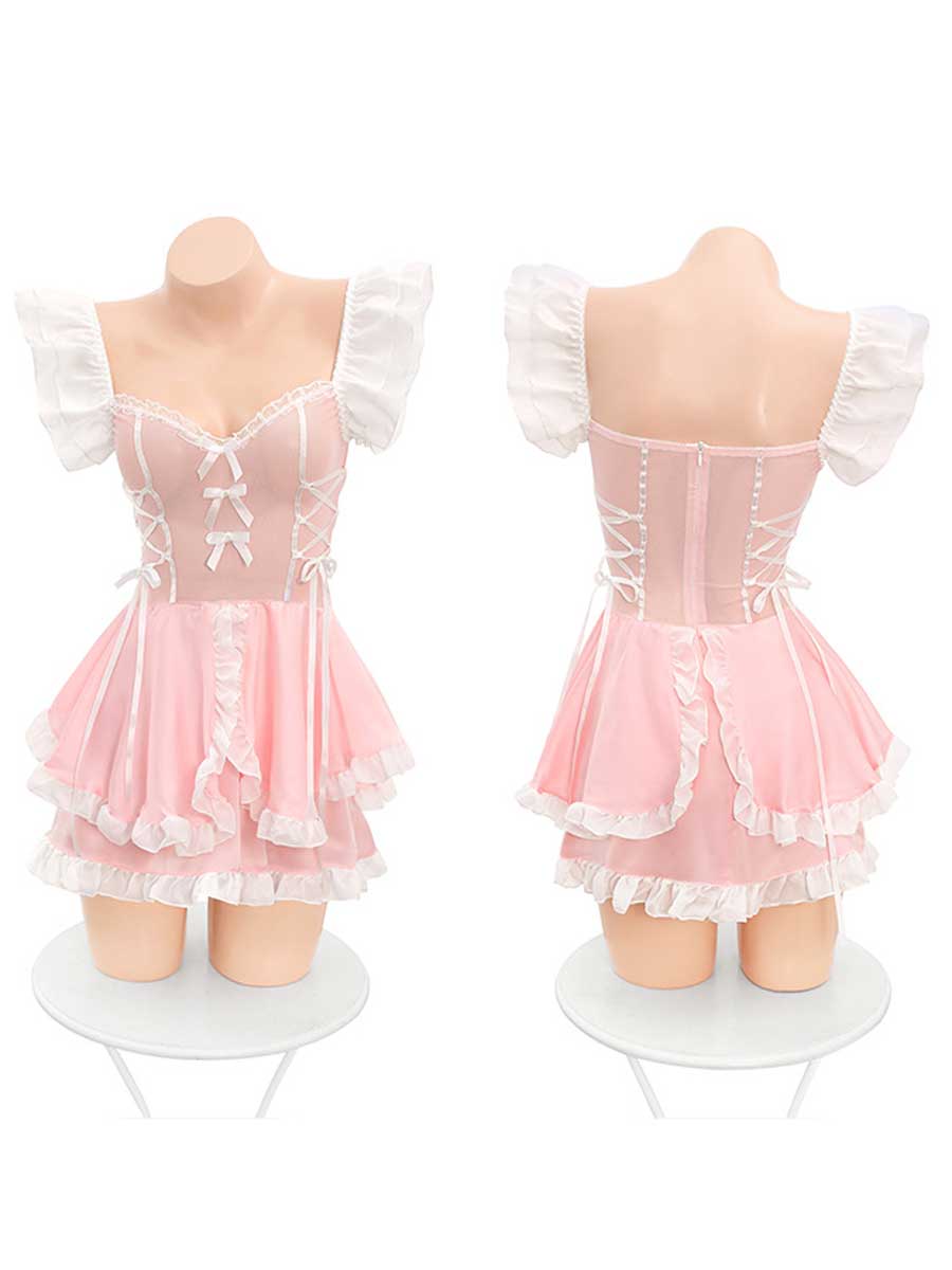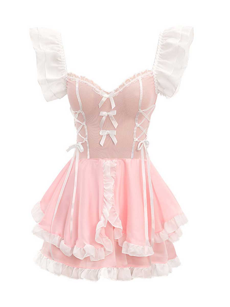 - Kawaii Maid Lingerie - Front white satin bow accent, a double satin ribbon lace-up at waist, a ruffled bust and cap sleeves