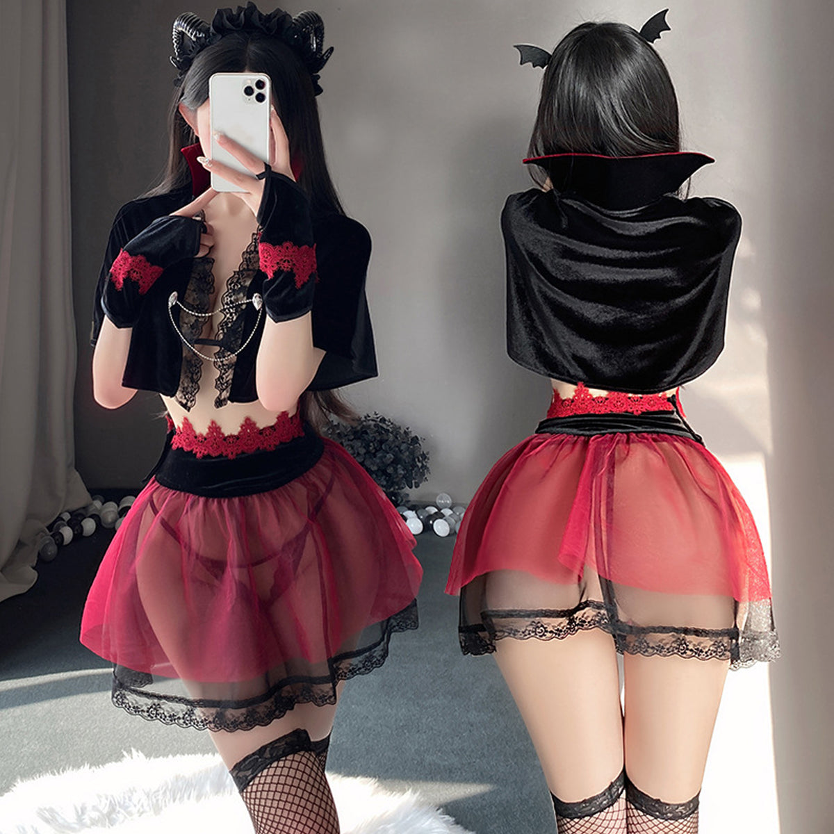 Design: Yomorio Demon Girl Outfit featuring velvety black cape with metal chain clasp and lace trim, sheer mesh skirt with velcro closure, red guipure lace at waist, and double tiered hem, provides an alluring and seductive look.
