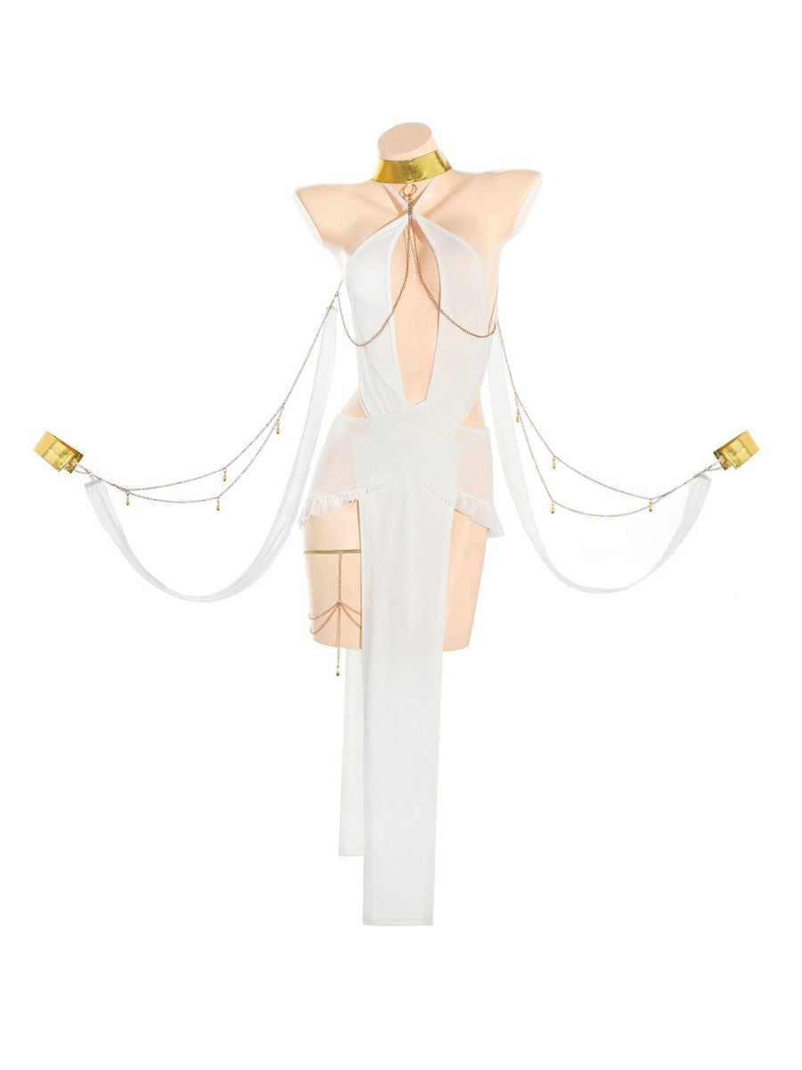 Design: Yomorio Sexy Queen Costume featuring a white, sheer long dress, a plunging halter neckline, overlaid with long, draped panels of white sheer chiffon or similar flowing fabric, and attached arm drapes with wrist cuffs.