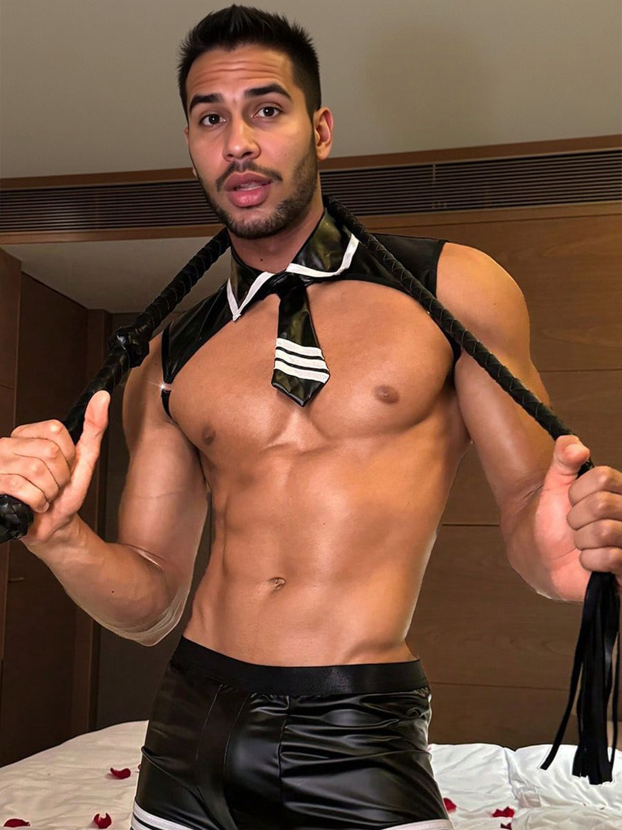 Design: Men‘s Policeman Costume featuring a pu leather crop top, a black-and-white contrast design, completed with form-fitting, elastic waist shorts, stylish white stripes for a sporty and provocative edge.
