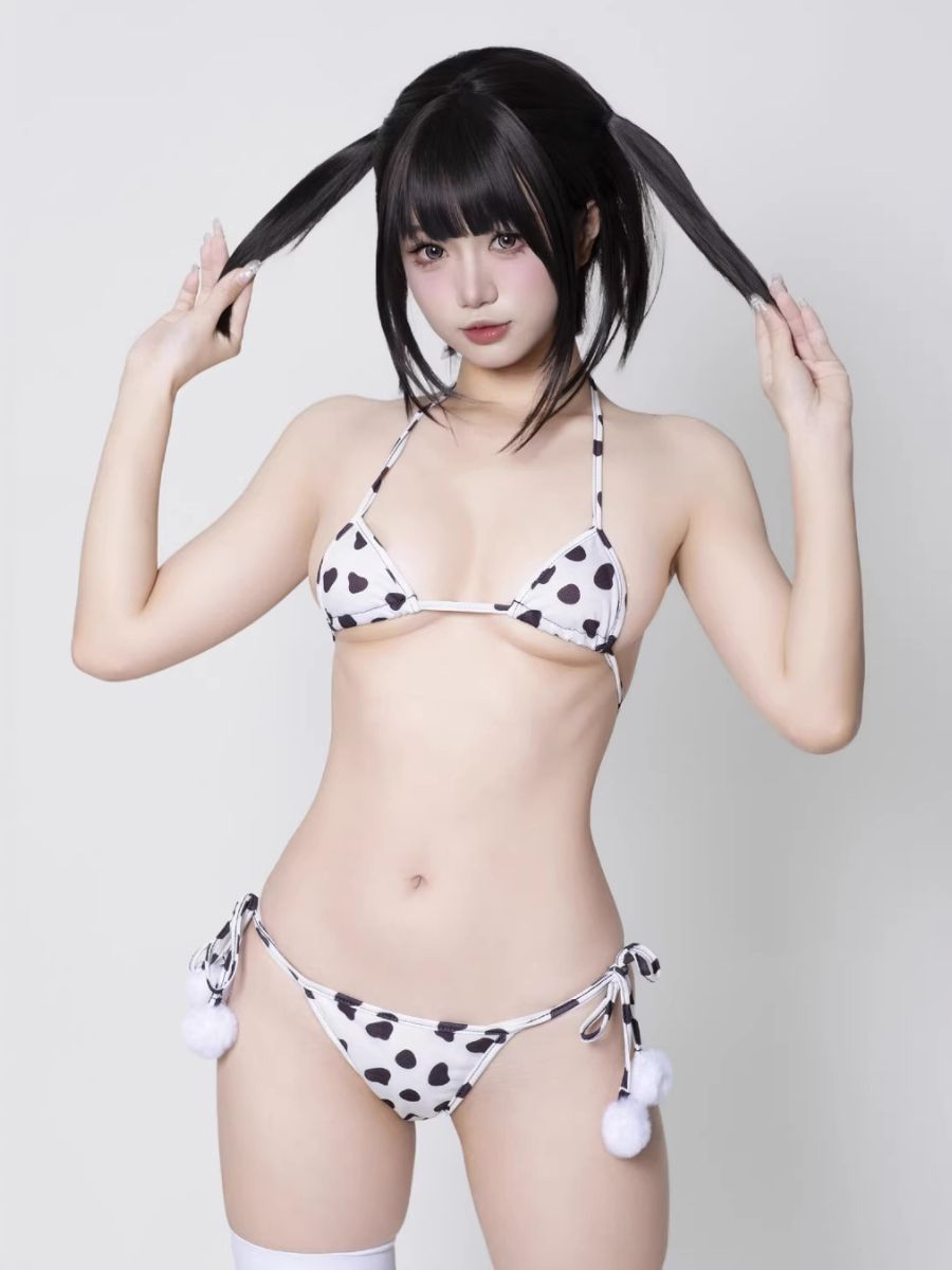 Design: Yomorio Sexy Milk Cow Cosplay Costume features a shrug style ultra crop hoodie with adorable plush pink horns and ears, a classic cow print triangle string bikini top and low rise bottoms, and a matching thigh high stockings for a complete, head-to-toe look.