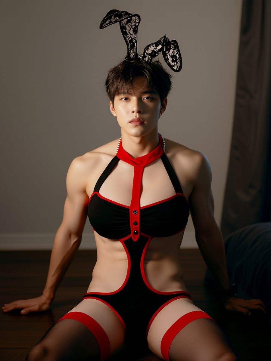 Design: Gothic Bunny Teddy Lingerie featuring black teddy lingerie with a deep plunge and high-cut leg openings, a matching bunny ears headpiece and thigh-high stockings for a professional cosplay finish.