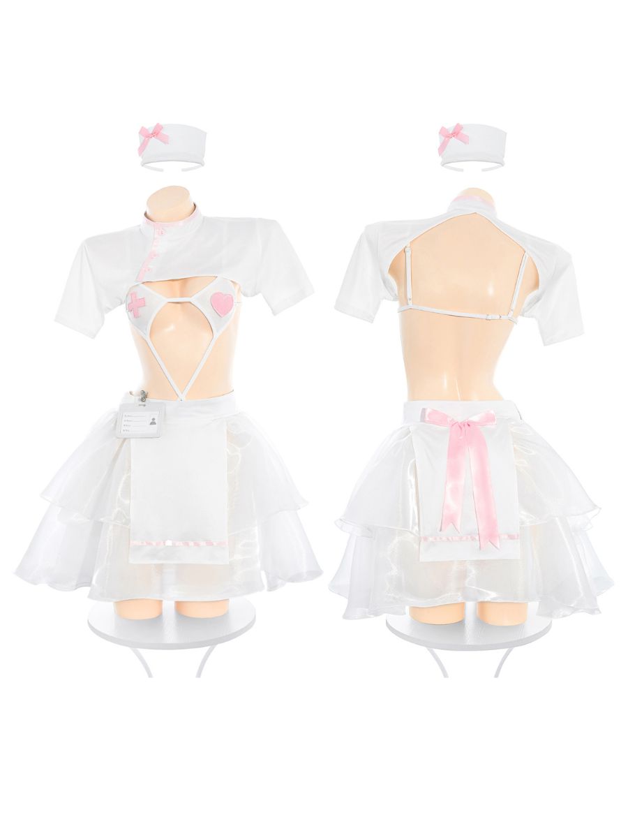 Design: Sexy Nurse Costume featuring a short-sleeved white shrug, a classic nurse collar and pink button accents, offering just enough coverage to build anticipation. Hollow-out strappy teddy featuring heart and cross appliqués, intricate strap detailing, and a high-cut leg to elongate your silhouette, and a matching double-layered sheer tulle skirt.
