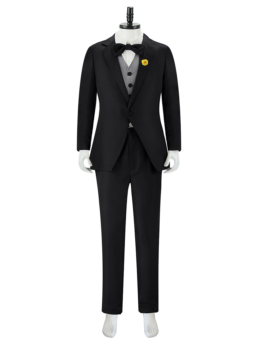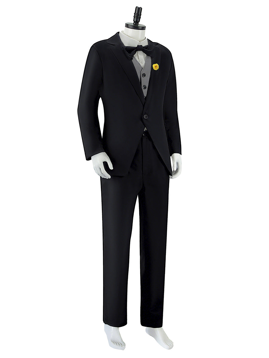 Design: Black Con-artist Fox Costume featuring a black coat, a white shirt, a vest, a matching trousers, pair with black bowtie and yellow corsage, restores the roles character.
