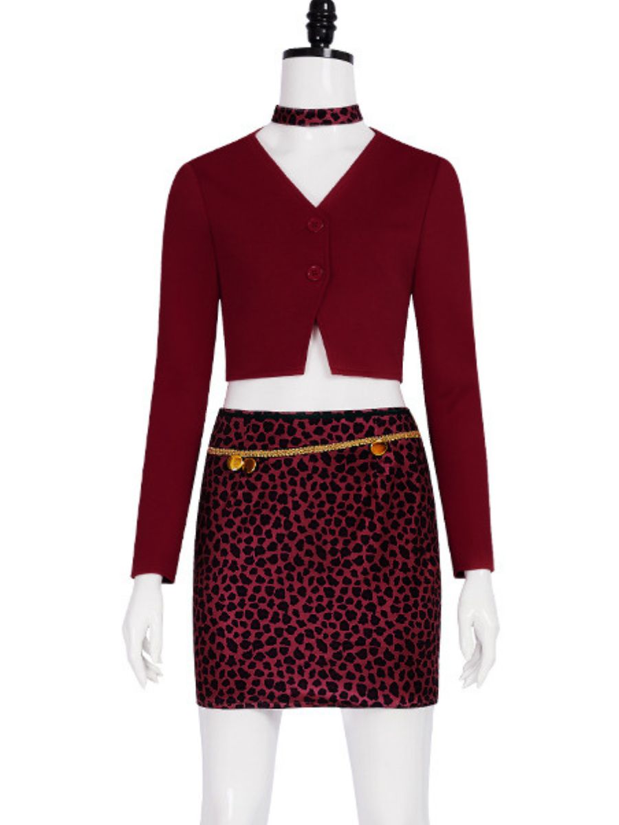 Design: Horror Mary Cosplay Costume featuring a burgundy long sleeve top, a plunging V-neckline and two-button closure, and a matching high-waisted leopard print skirt with gold chain belt detail, restores the roles character.