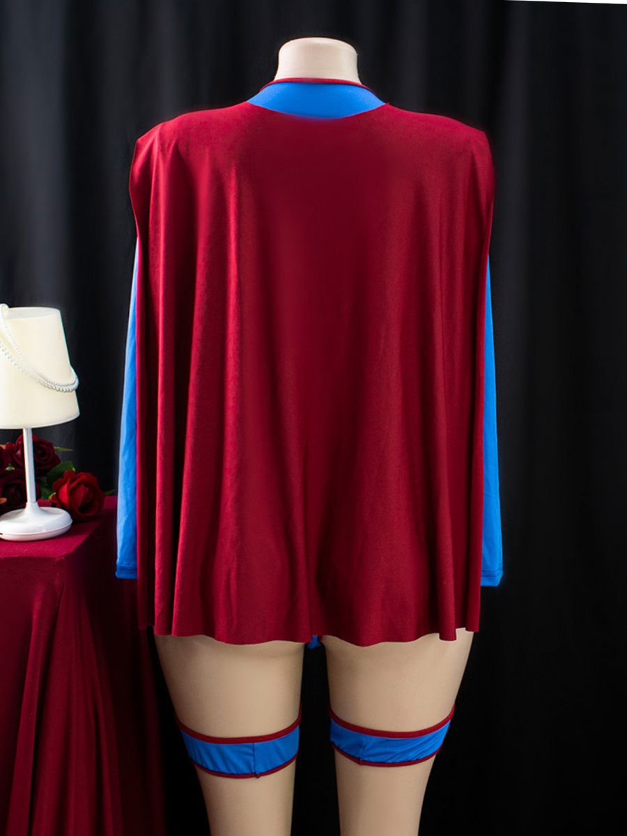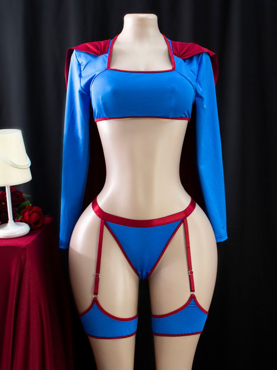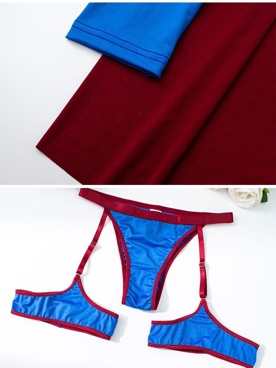 Design: Super Lady Role-playing Cosplay Costume featuring a long-sleeved, blue crop top with a square neckline, an attached long, flowing red cape, and a matching blue thong, a red elastic waistband and integrated garter straps.