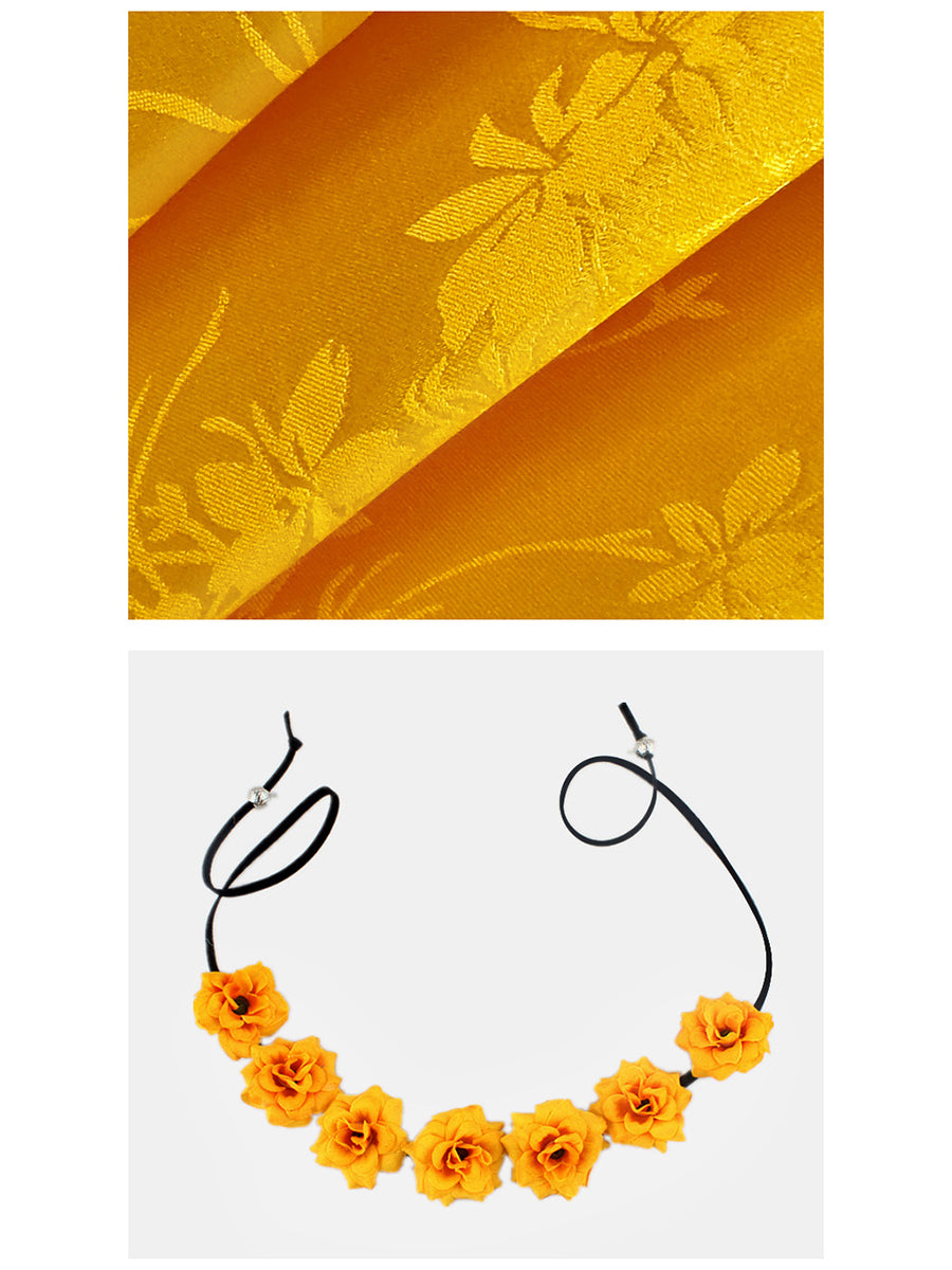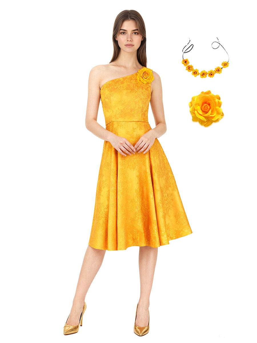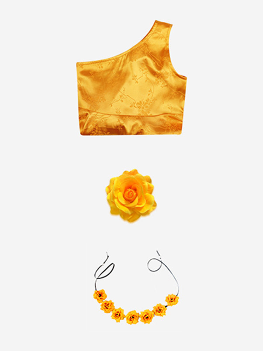 Design: This yellow bunny-inspired one-shoulder costume set featuring a yellow dress, a matching floral hairband, and a yellow corsage— everything you need for a cheerful, eye-catching look.