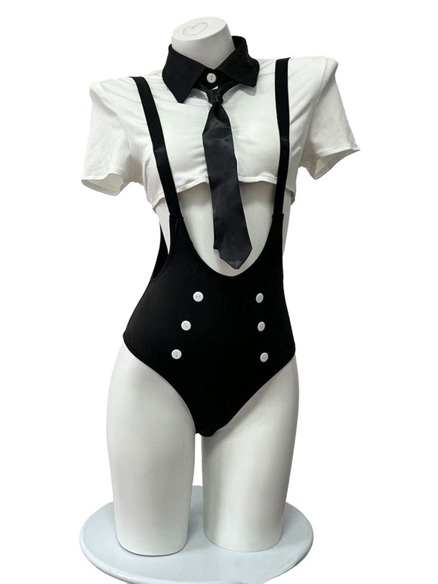 Design: This Sexy Bunny Costume featuring white short-sleeved, cropped top with a lapel collar and a black tie detail, a front button closure, pair it with black suspender shorts, and a matching bunny ears headpiece, this costume creates an edgy yet playful look that will get all the attention.