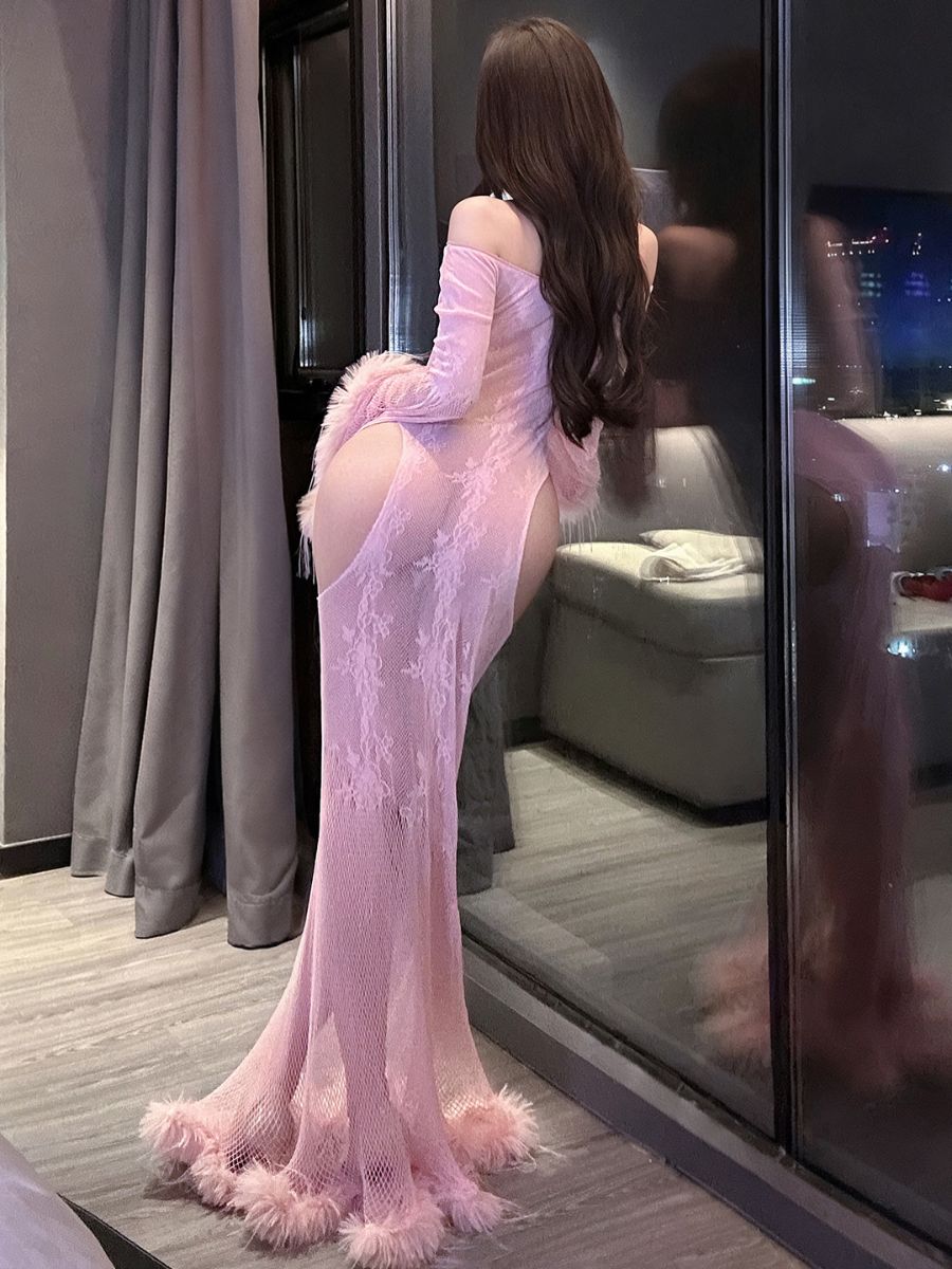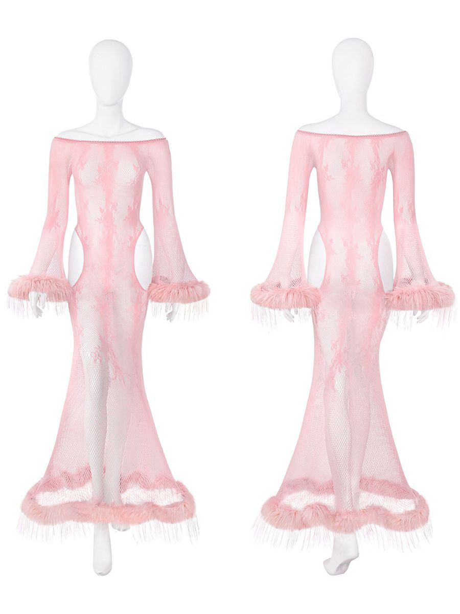 Design: This flirty fishnet chemise featured a plush, oversized faux fur trim at the bell sleeves and the floor-sweeping hem, off-the-shoulder neckline and daring waist cut-outs accentuate the natural curves of the body, creating an elongated and flattering profile.