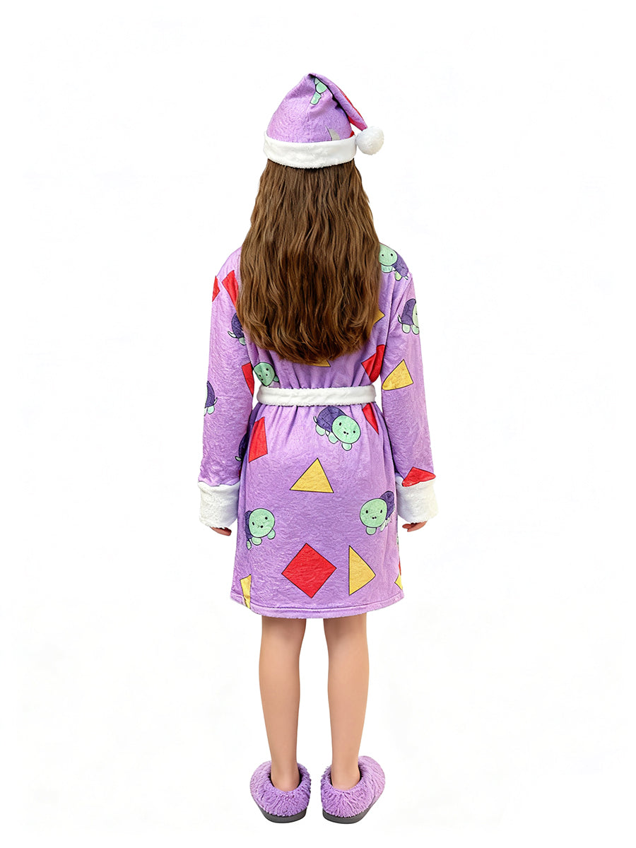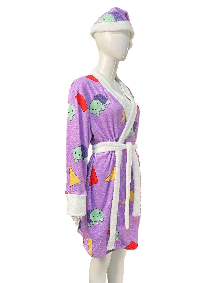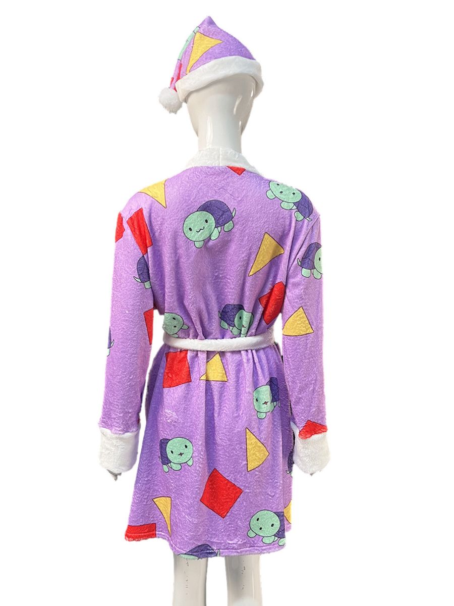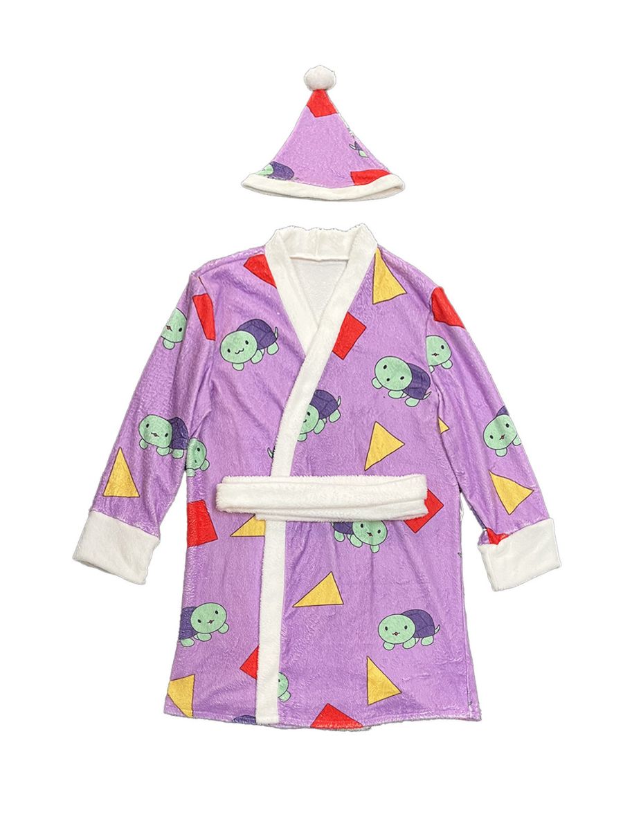Design: Anime Christmas Plush Robe Set featuring a soft fleece robe adorned with cute turtle prints and colorful geometric shapes, paired with a matching Santa hat for a festive touch.