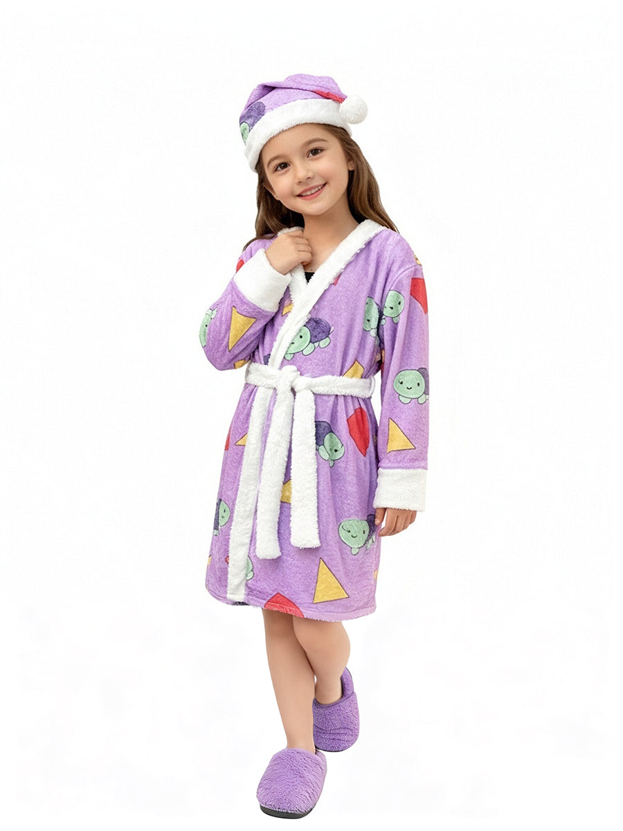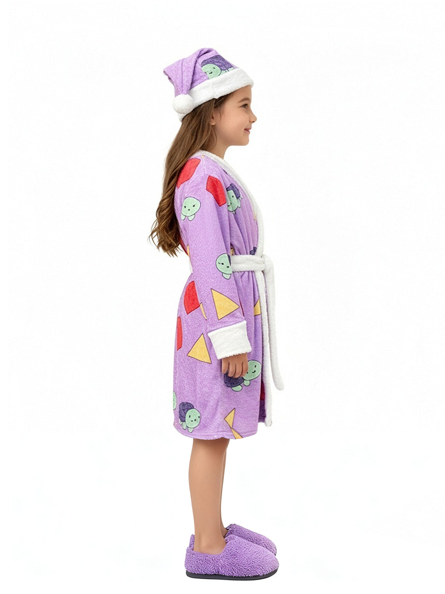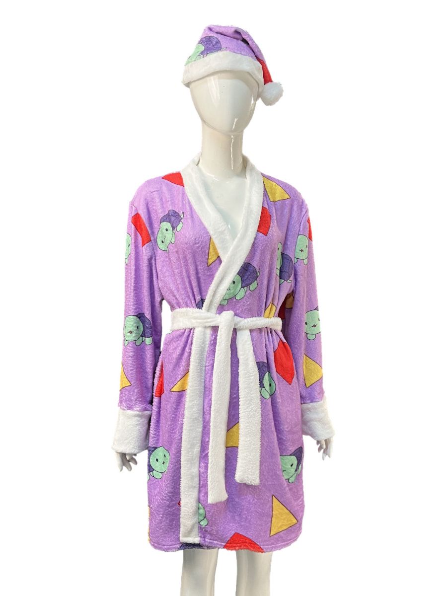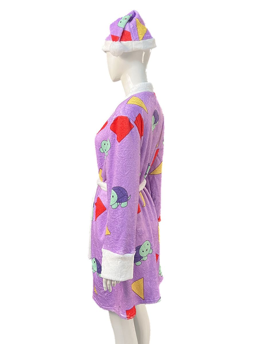 Design: Anime Christmas Plush Robe Set featuring a soft fleece robe adorned with cute turtle prints and colorful geometric shapes, paired with a matching Santa hat for a festive touch.