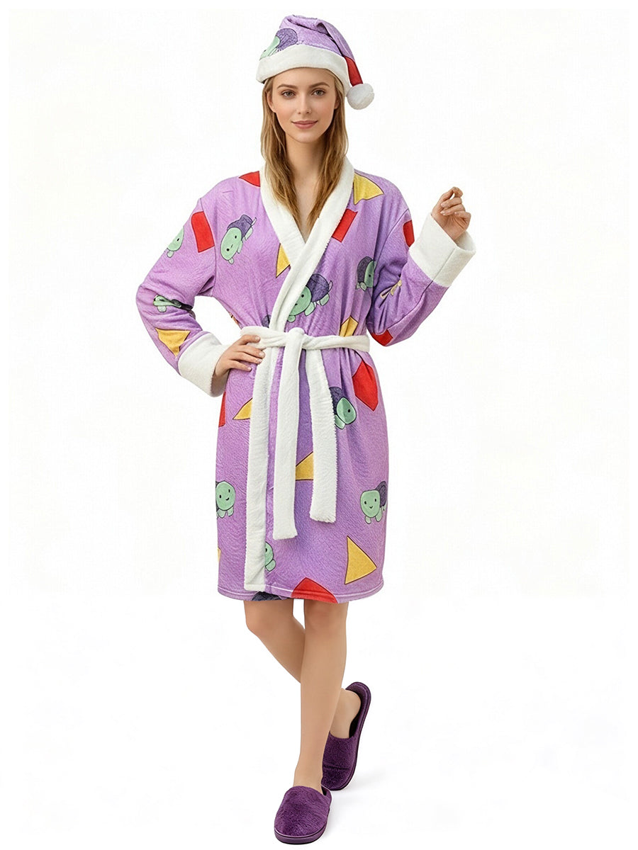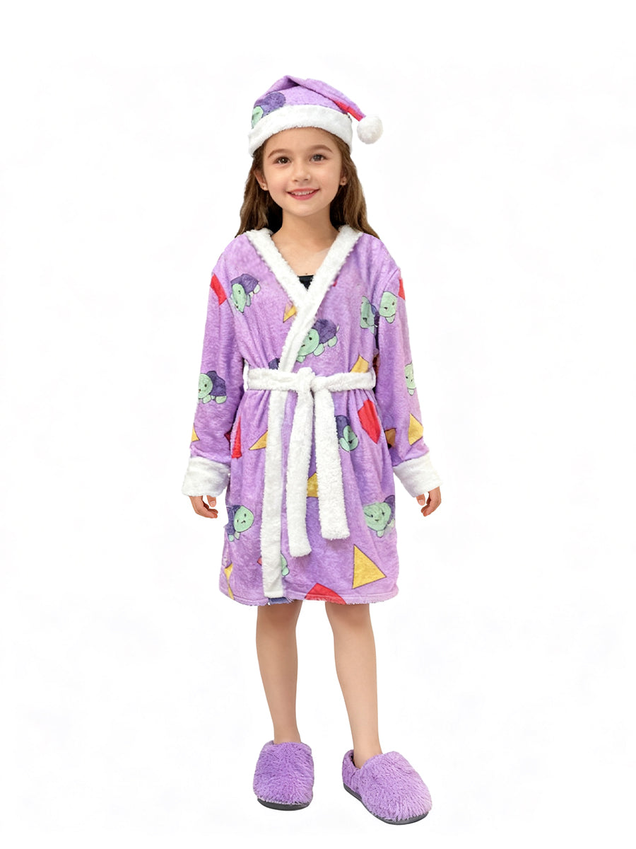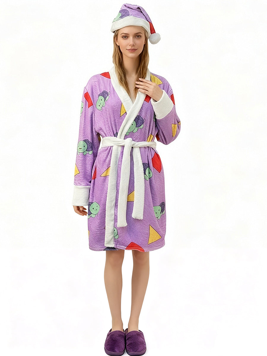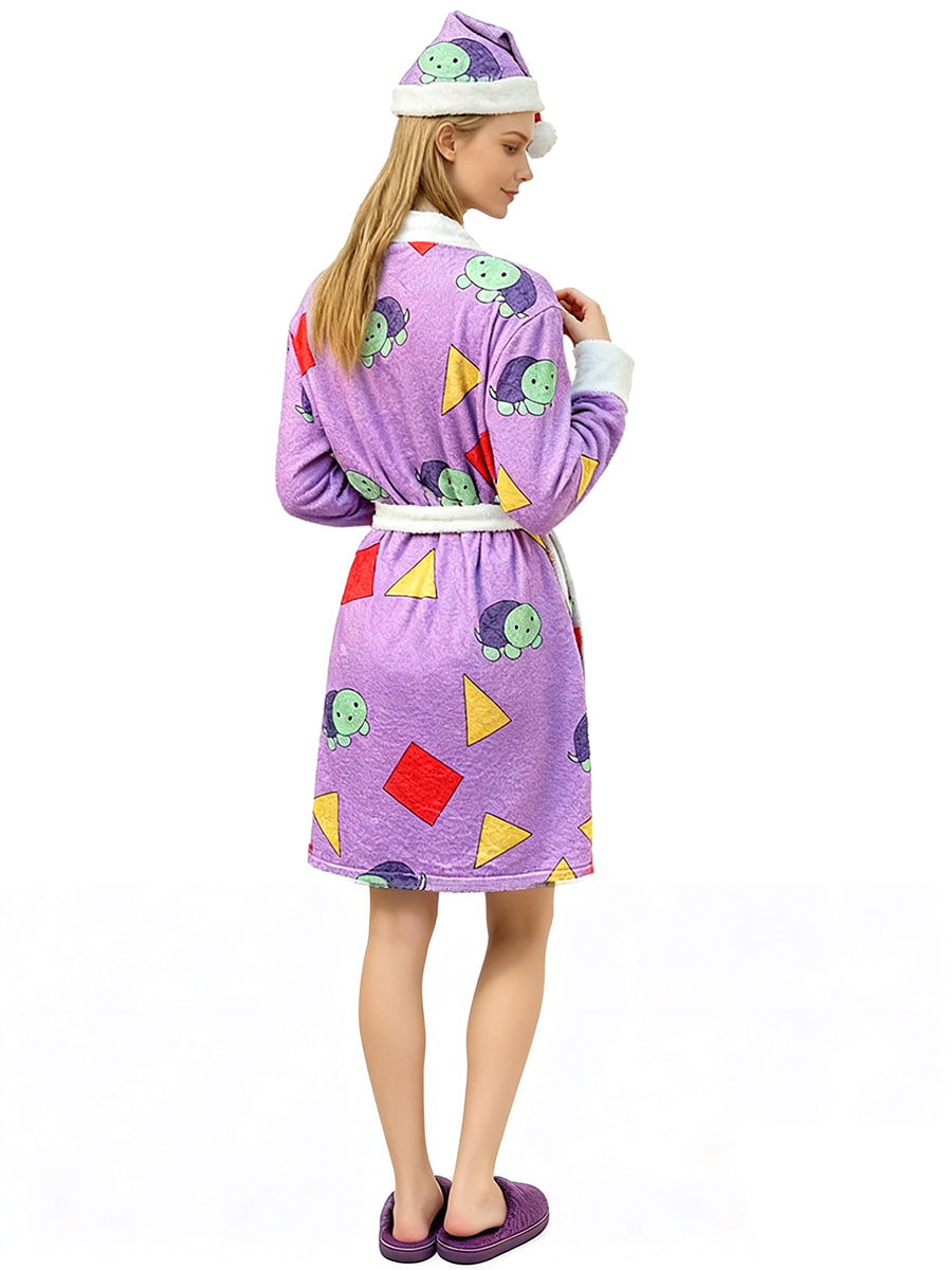 Design: Anime Christmas Plush Robe Set featuring a soft fleece robe adorned with cute turtle prints and colorful geometric shapes, paired with a matching Santa hat for a festive touch.