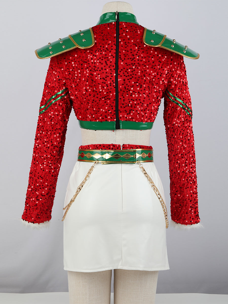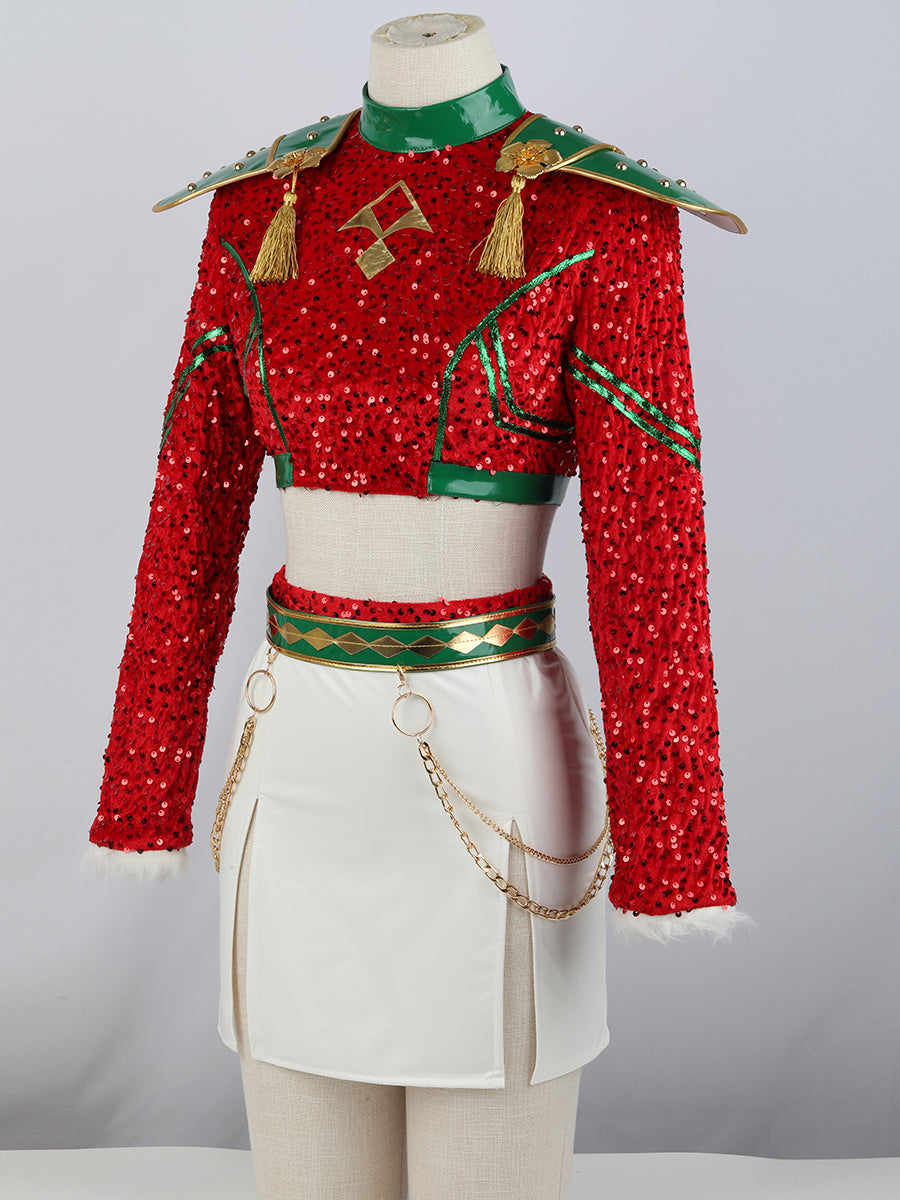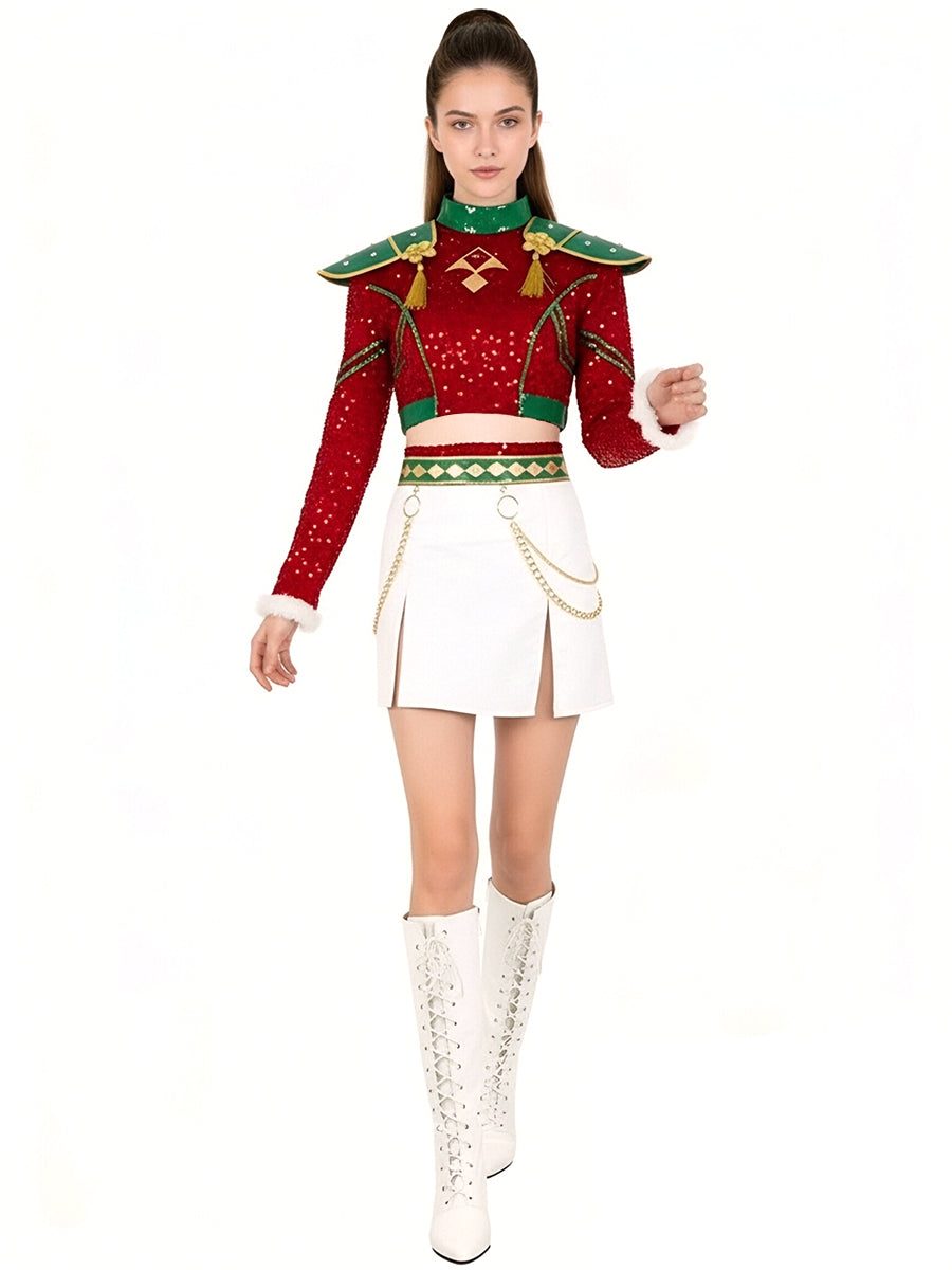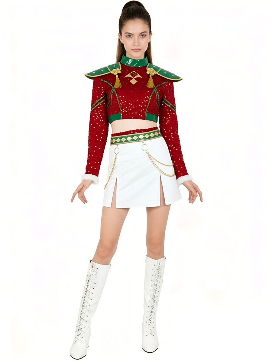 Design: Christmas Super Idol Costume featuring a red sequin crop jacket adorned with green epaulets, metallic trim, and golden tassels, creating a bold, and a matching white mini skirt comes detailed with layered metallic chains, oversized rings, and sequin waistband accents, it’s perfect for creating a fun and festive holiday look.