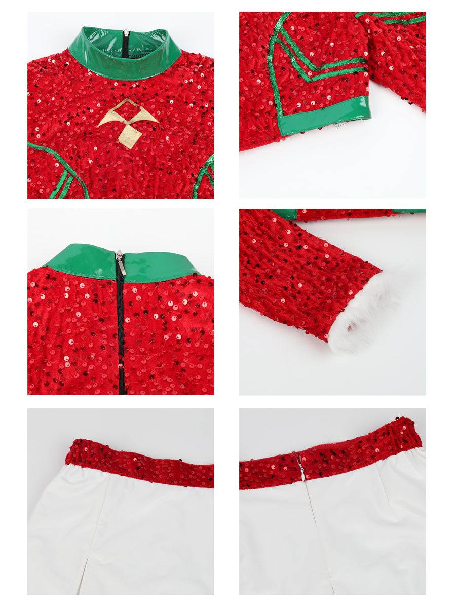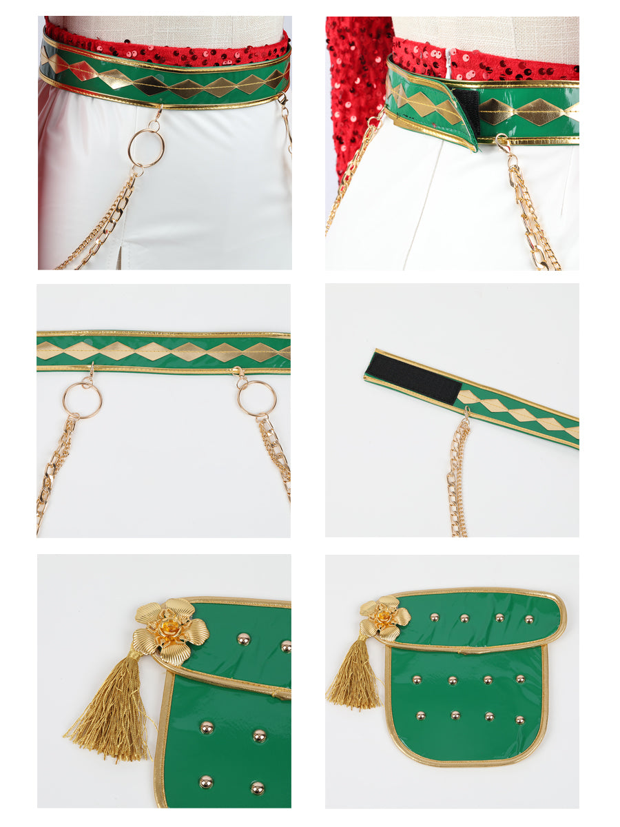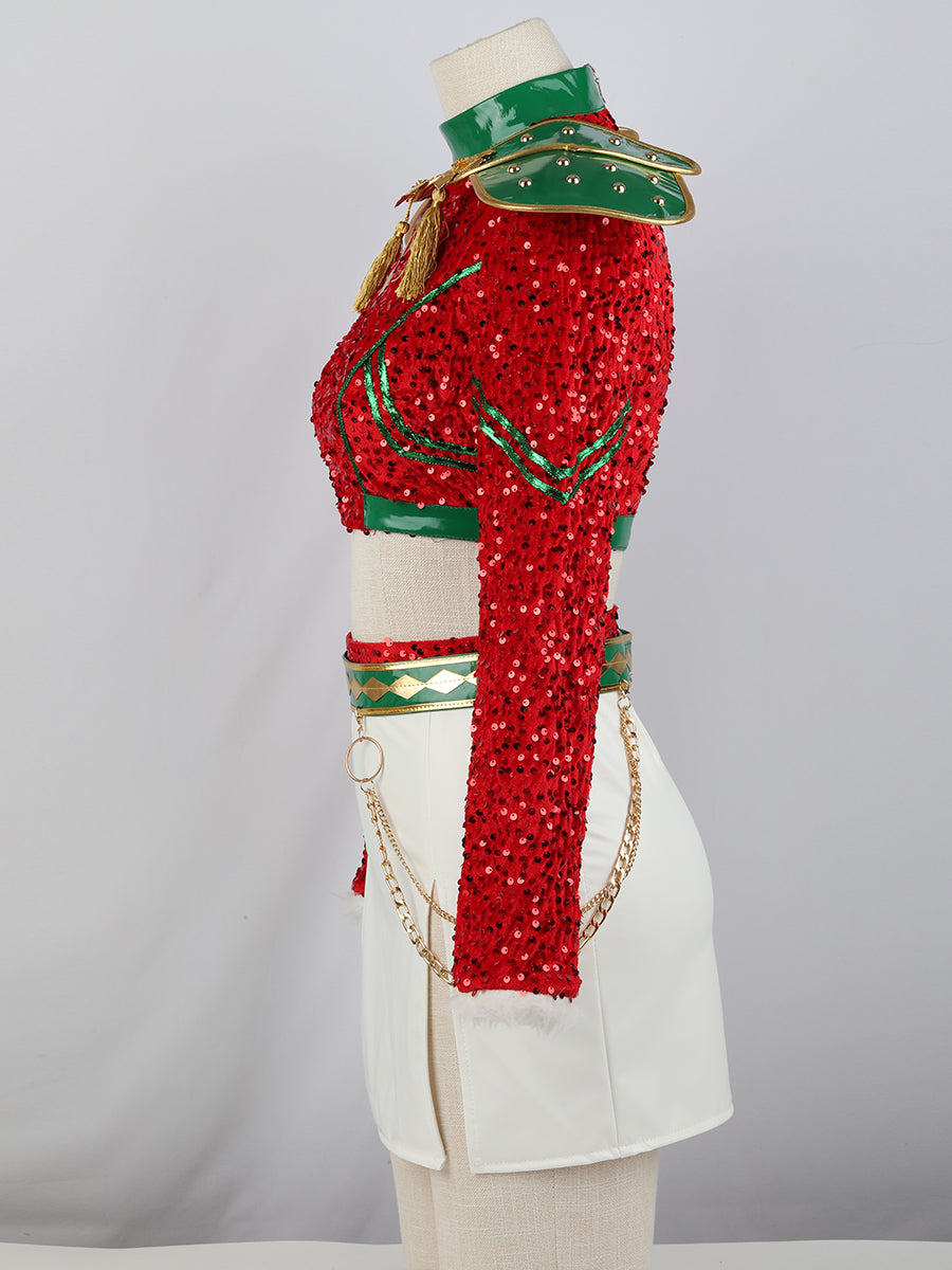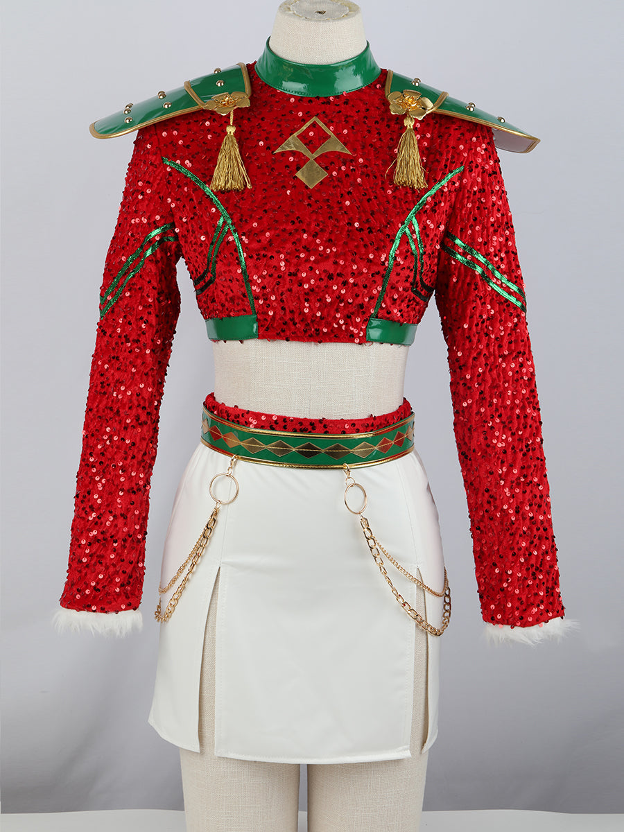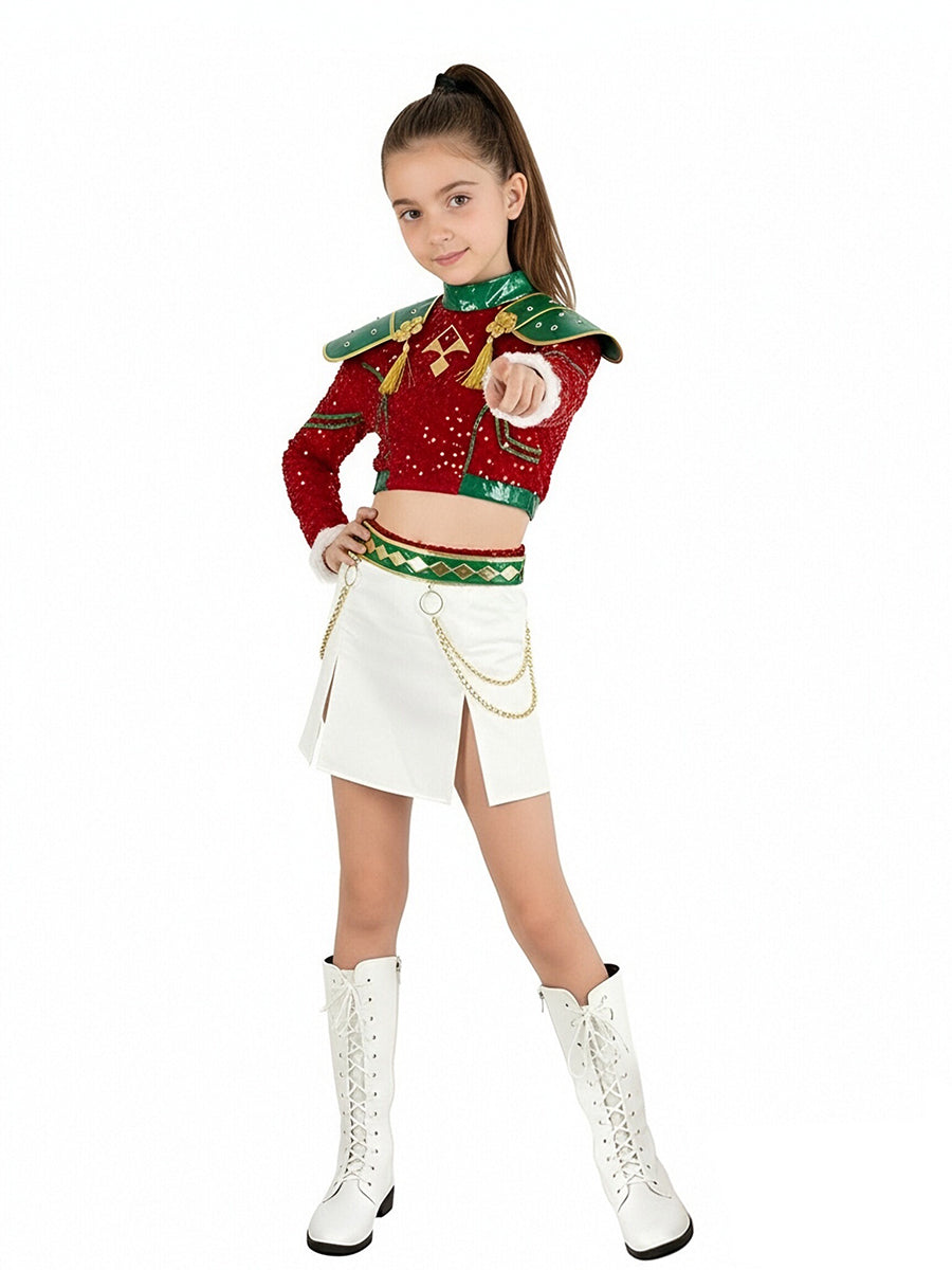 Design: Christmas Super Idol Costume featuring a red sequin crop jacket adorned with green epaulets, metallic trim, and golden tassels, creating a bold, and a matching white mini skirt comes detailed with layered metallic chains, oversized rings, and sequin waistband accents, it’s perfect for creating a fun and festive holiday look.
